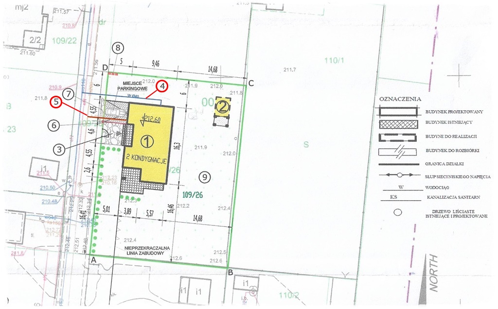Numer 4 to przyłącz wodociągowy, 5 – kanalizacji sanitarnej, a 6 to przyłącz energetyczny. Przyłącza kanalizacji deszczowej i gazowy nie zostały zaprojektowane, jako że w mojej okolicy nie ma takich sieci, do których można byłoby je wpiąć.