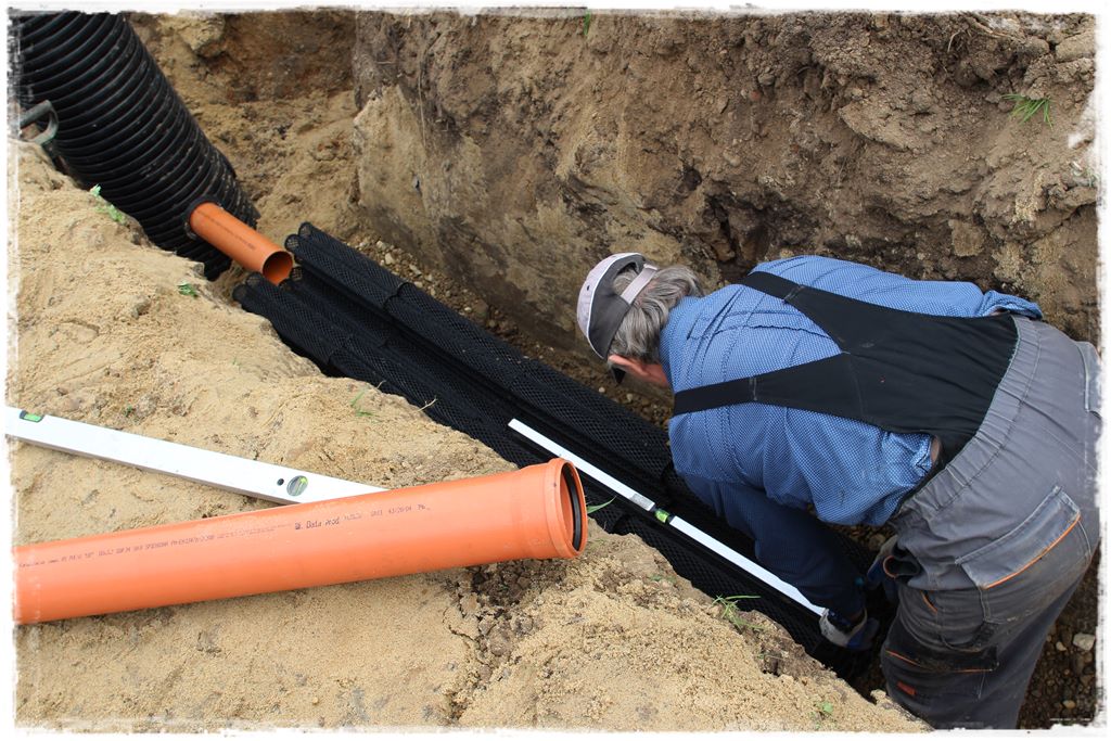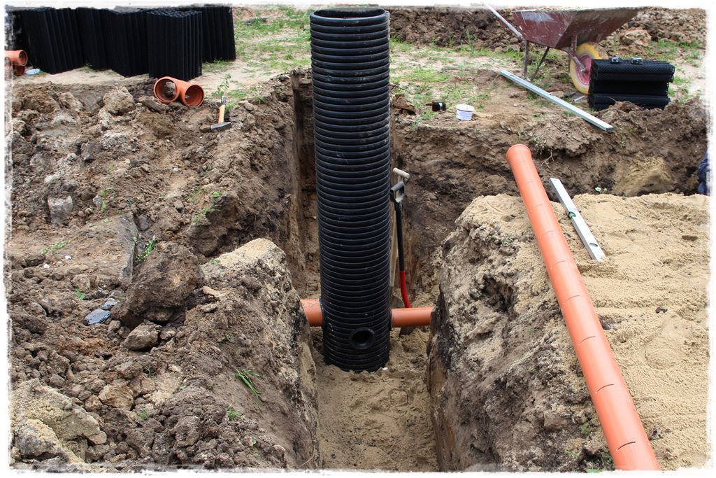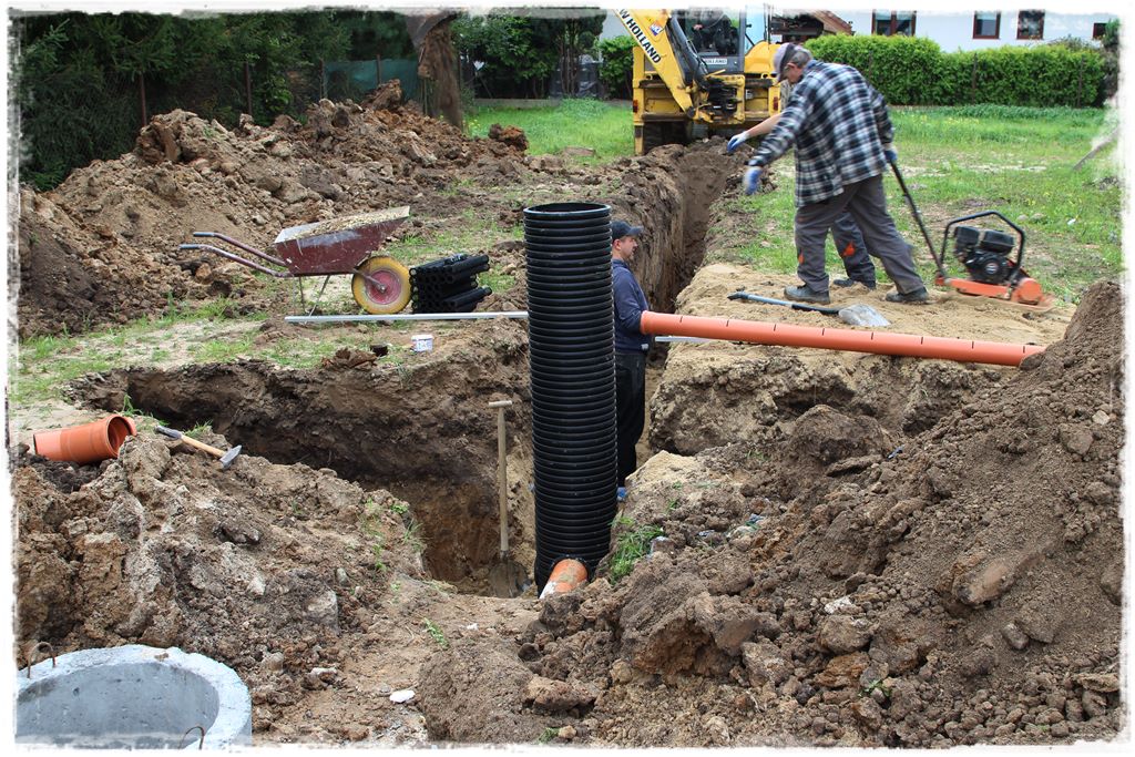 Jak wiesz z postu nr 4 o przyłączach technicznych (wodociągowym i kanalizacji sanitarnej) do budynku, ich wykonaniu przyświeca pewna procedura. I podobnie byłoby w przypadku przyłącza kanalizacji deszczowej, jeśli wpinałby się do ogólnej sieci (kanalizacji deszczowej) zlokalizowanej gdzieś poza terenem działki. Natomiast w moim przypadku przy działce nie ma sieci kanalizacji deszczowej, a zatem nie wykonuję typowego przyłącza łączącego budynek z tą siecią.