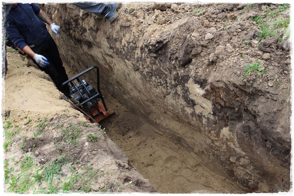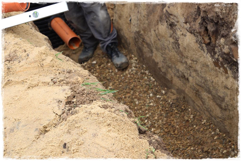 Ze studni wychodzą trzy nitki linii rozsączających. Zasada ich wykonania jest identyczna, stąd spójrz na kolejność działań i zastosowanych warstw. Na początek oczywiście konieczny jest wykop. W nim, jako pierwsza warstwa, około 30 centymetrów ubitego zagęszczarką piasku.