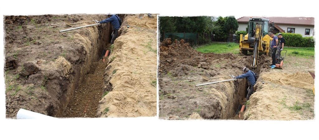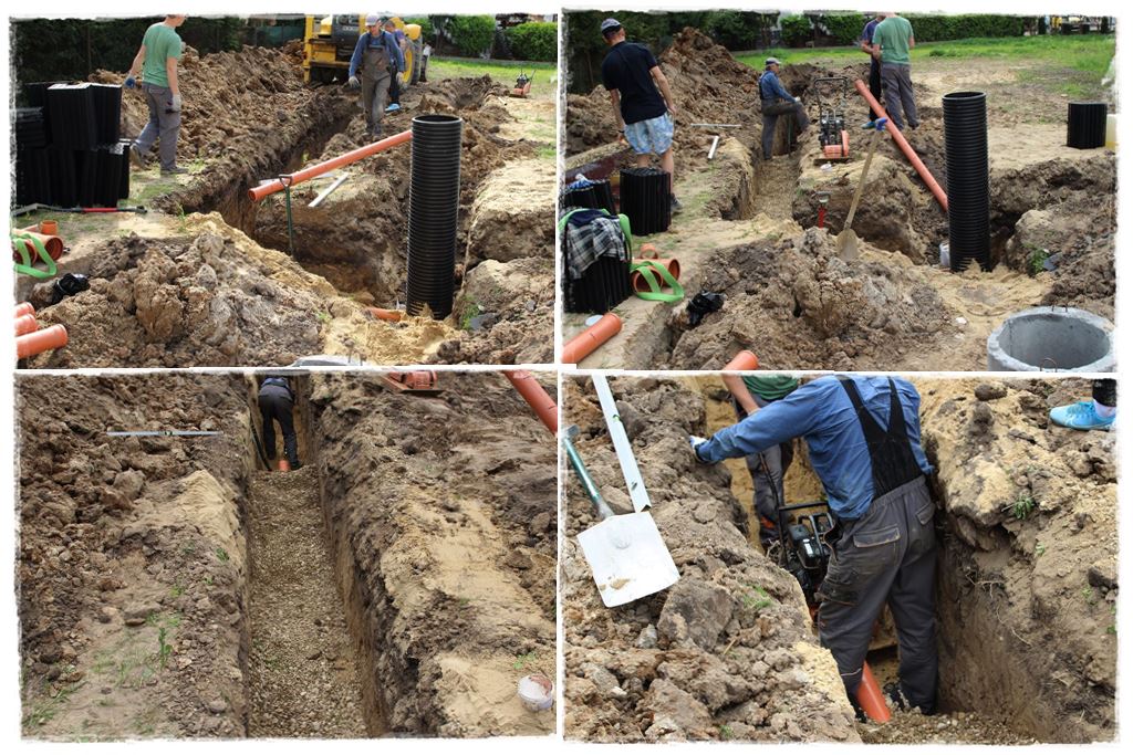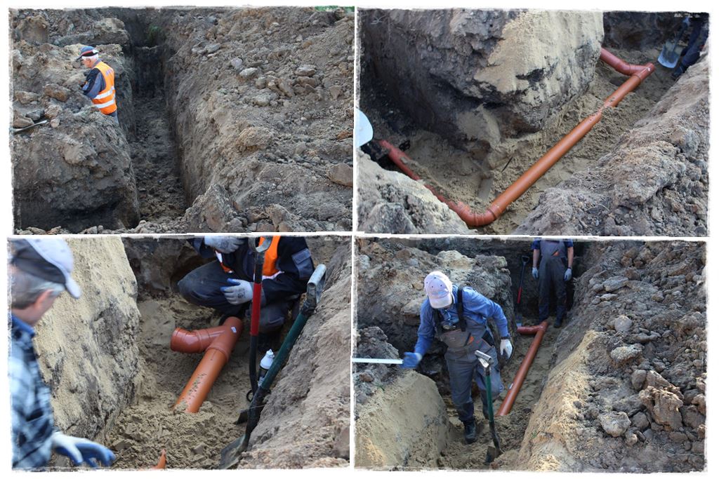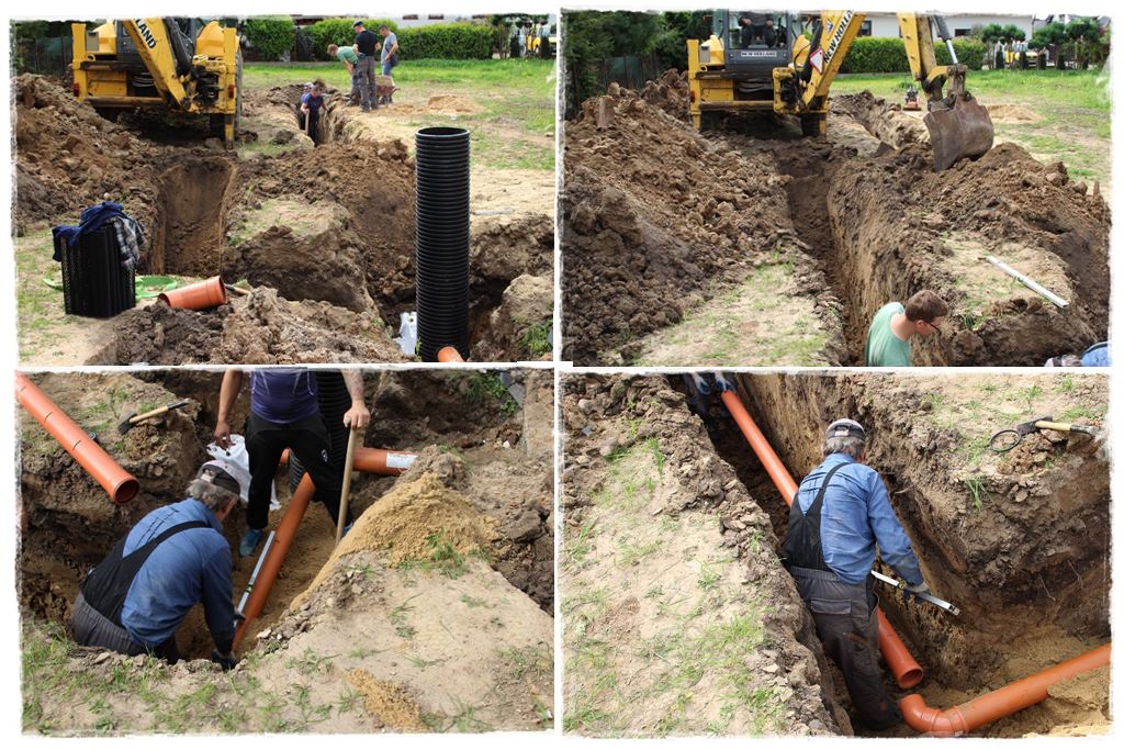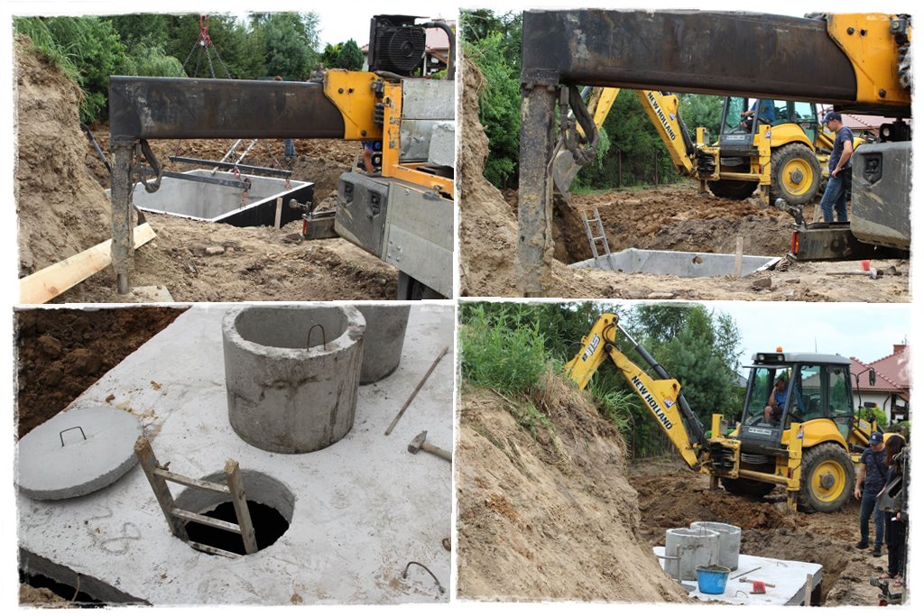 Obrys częściowo przysypanego już zbiornika pokazałem kolorem białym, a wszystkie sieci do wykonania kolorem czerwonym i pomarańczowym. Dodatkowo kolorem czarnym studnię rozdzielającą. A zatem to tyle tytułem wstępu. Tymczasem spójrz, jak wyglądała budowa.