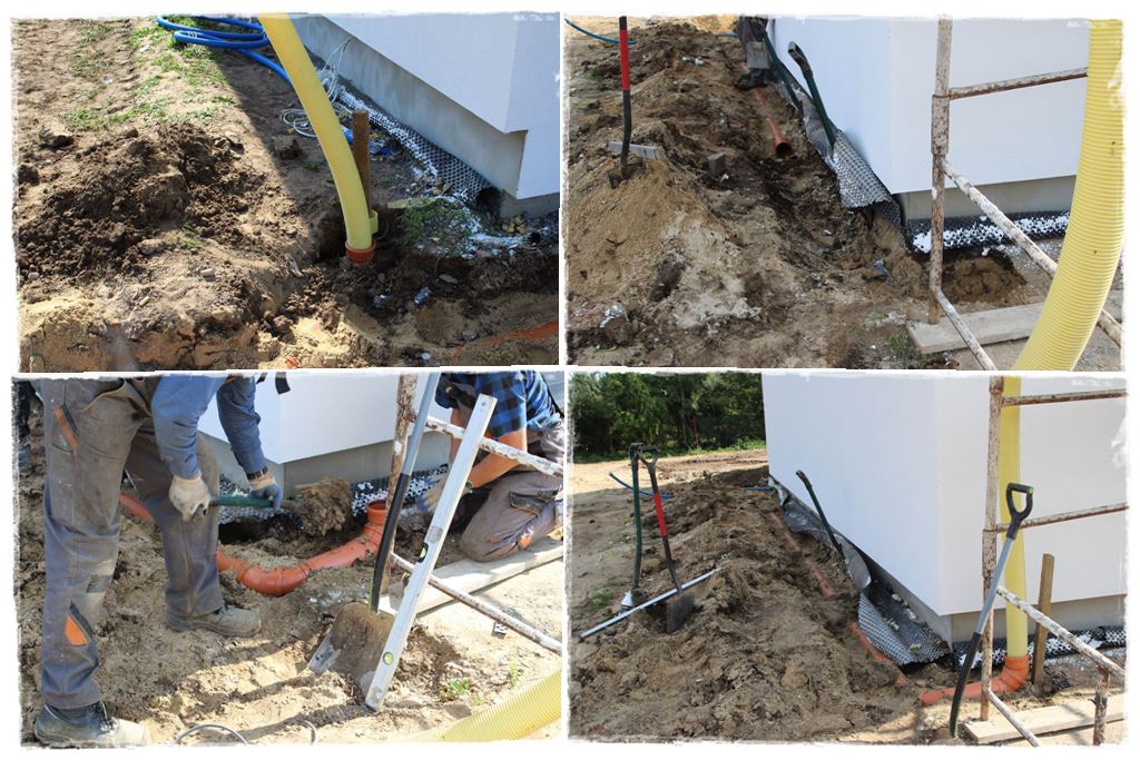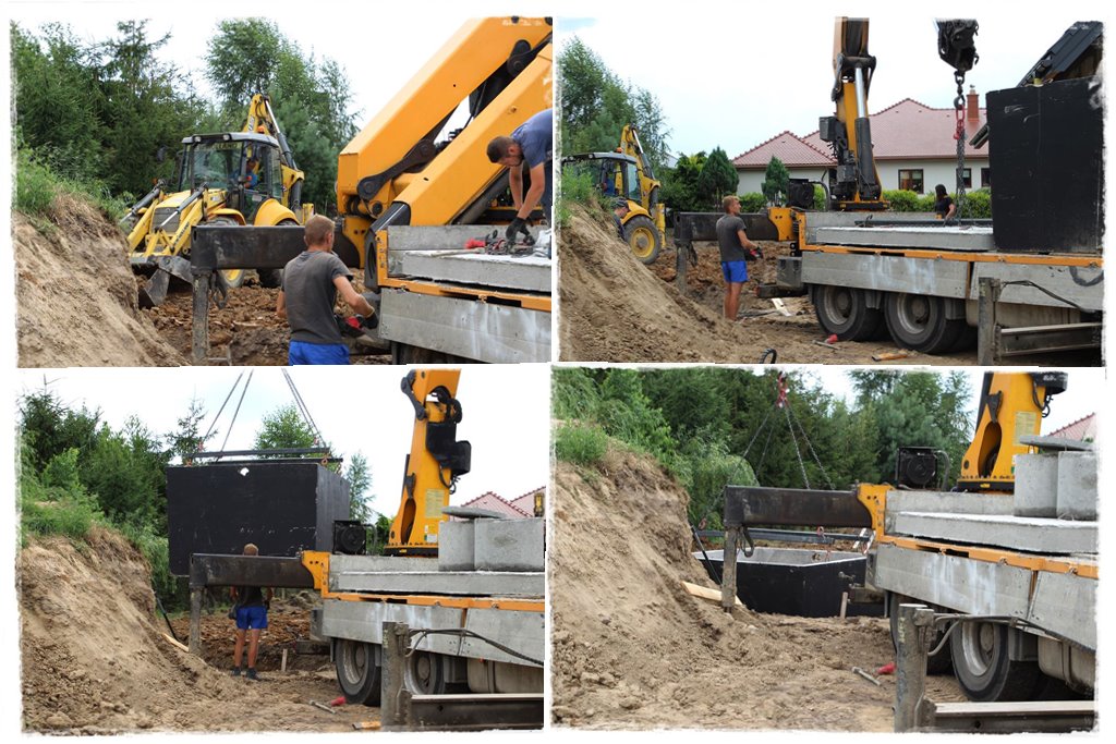 I tak, jak z kolei wiesz z postu nr 5, wcześniej osadziliśmy już zbiornik, a sieci między nim, a rynnami oraz drenaż wykonałem właśnie teraz. Zanim Ci to pokażę, dla przypomnienia kilka ujęć, jak wyglądało osadzenie zbiornika: