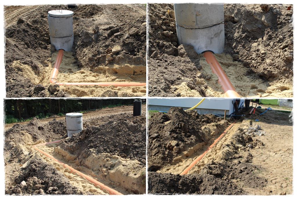 W miejsce tego wykonuję lokalną (w obrębię działki) sieć, która składa się z podziemnych odcinków kanalizacji łączących rynny budynku ze zbiornikiem oraz wychodzącego ze zbiornika drenażu, który będzie rozsączał nadmiar wody nie mieszczący się w zbiorniku.