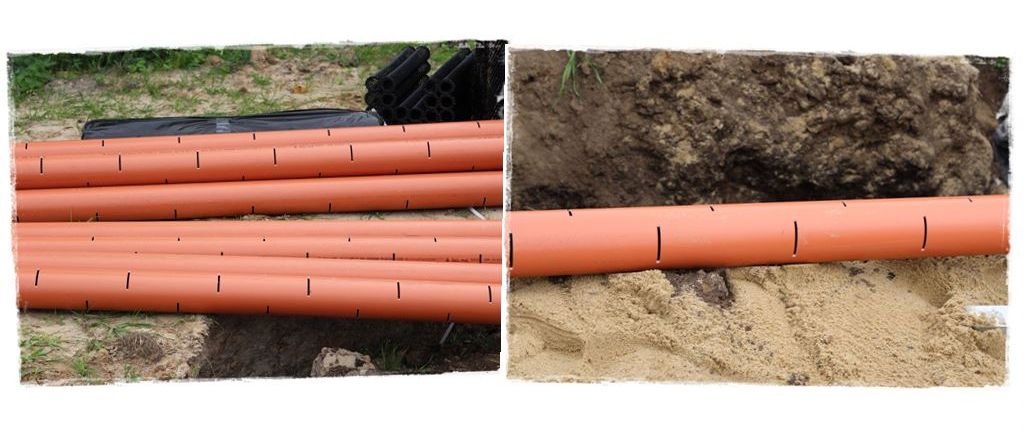 rury pcv kanalizacyjne. Jedne pełne, czyli mające zastosowanie w miejscach, które nie będą rozsączały (te pomarańczowe na schemacie) oraz nacinane, czyli mające zastosowanie na odcinkach rozsączających (czerwone na schemacie),