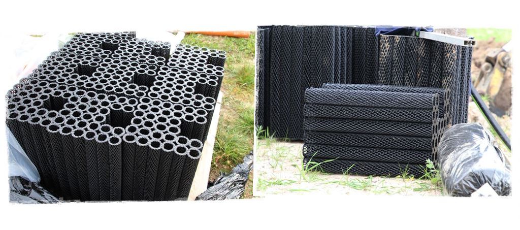 i dopiero na nim, układane ze spadkiem kosze rozsączające, a w nich, nacięciami do dołu rury pcv.