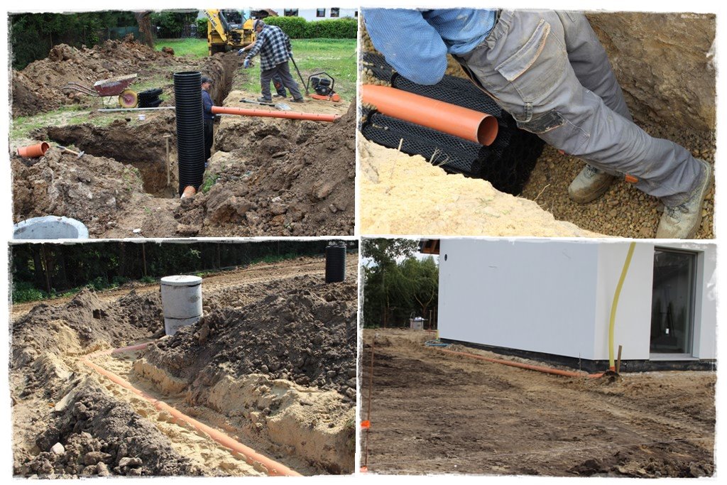 W miejsce tego wykonuję lokalną (w obrębię działki) sieć, która składa się z podziemnych odcinków kanalizacji łączących rynny budynku ze zbiornikiem oraz wychodzącego ze zbiornika drenażu, który będzie rozsączał nadmiar wody nie mieszczący się w zbiorniku.