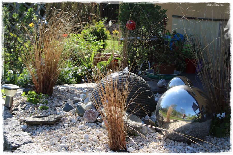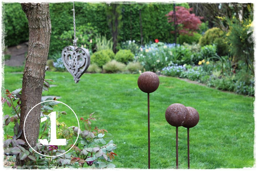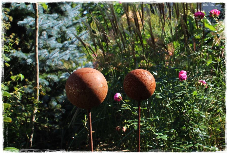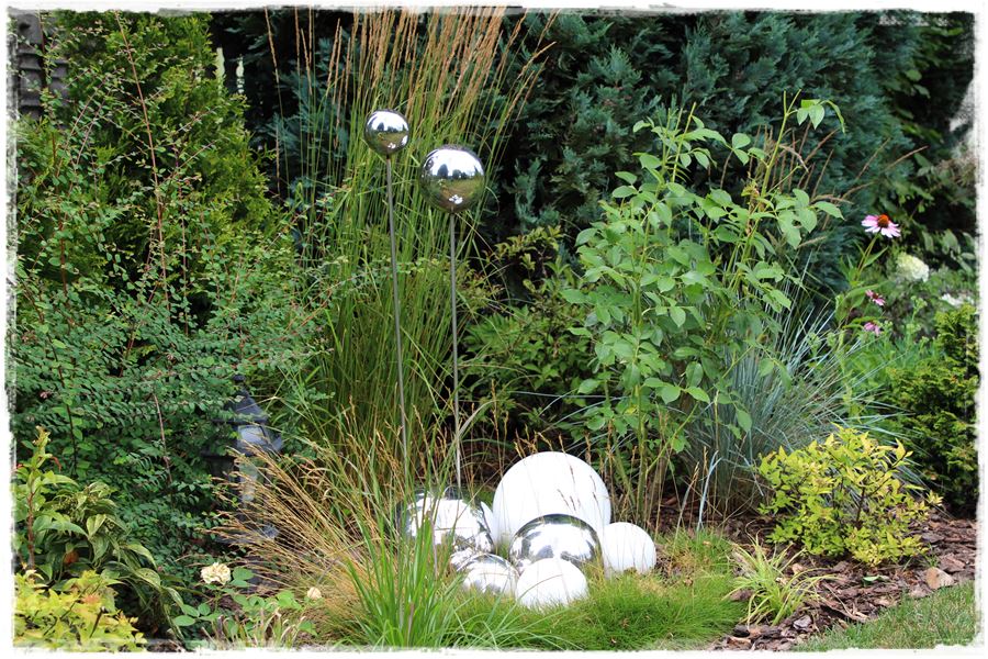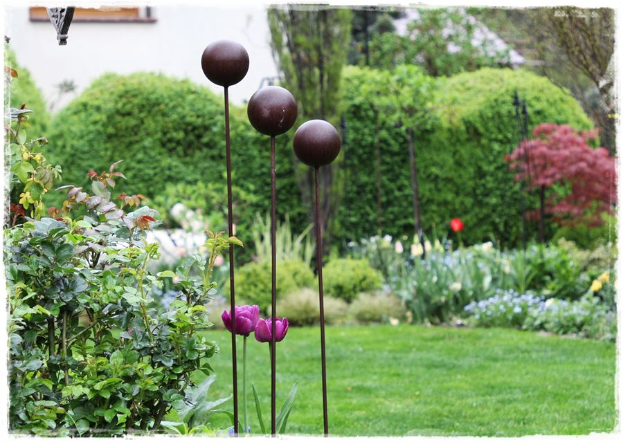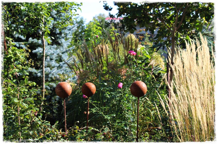 Niezależnie czy są to kule z surowego metalu pokryte rdzą, czy pokryte świecącą politurą, na rabatach zawsze wyglądają ciekawie. Wystają nieco ponad rośliny, tworzą wyższe piętro, a zatem przyciągają wzrok i wzbudzają ciekawość.