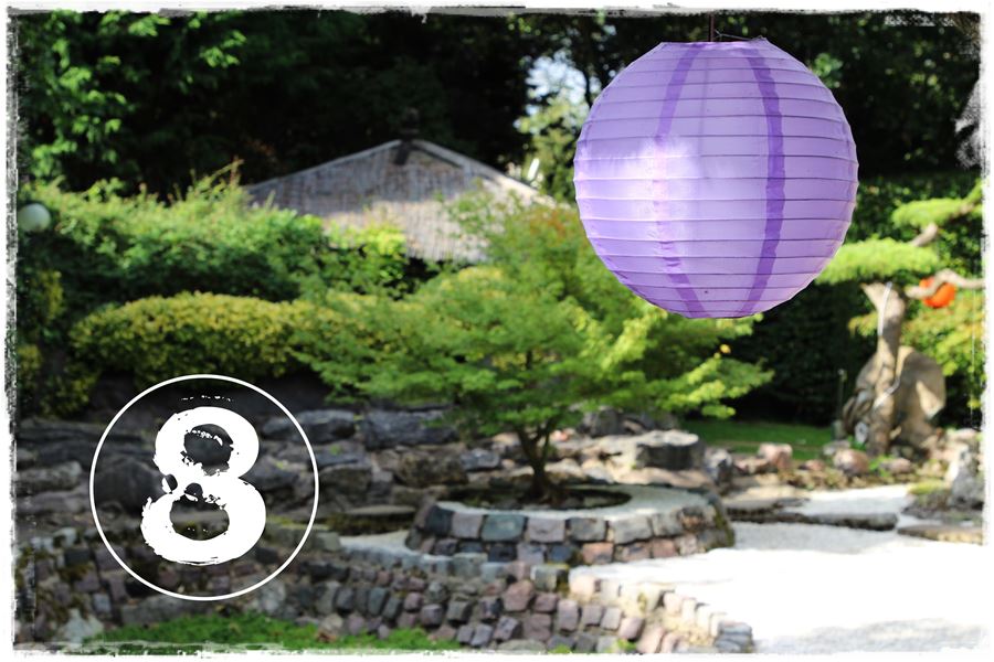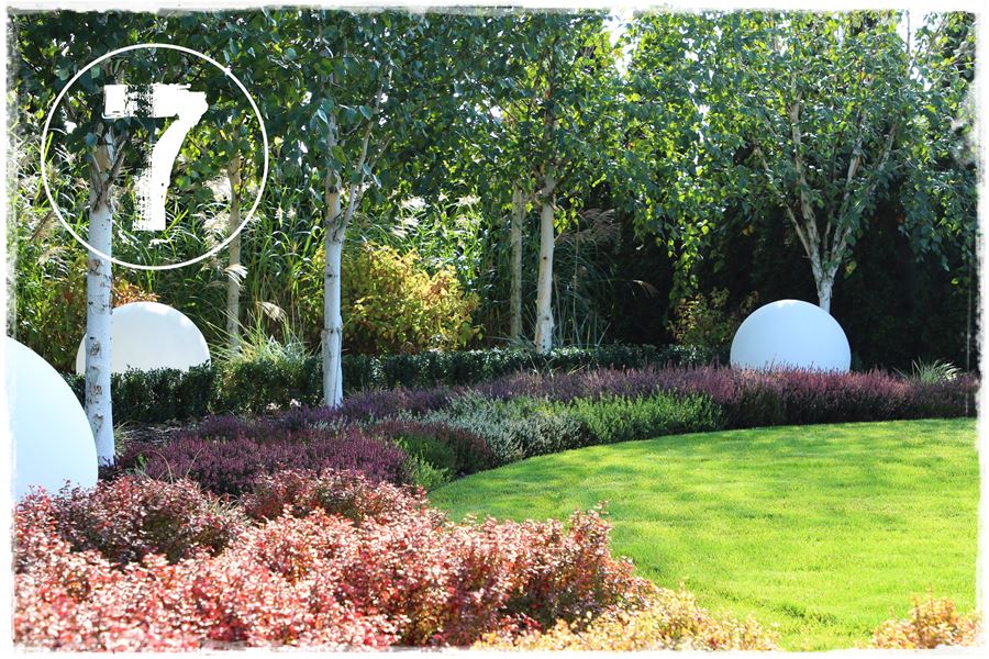 Propozycja numer siedem to kule lampy, które swoimi najczęściej białymi kloszami również ładnie kontrastują i wyróżniają się na rabatach, jednak prawdziwy ich urok ujawnia się po zmroku, kiedy to tworzą naprawdę, świetlny wyjątkowy efekt, wprowadzając do ogrodu kolejny ważny element, właśnie światło.