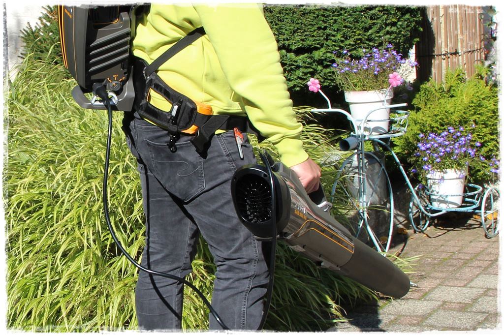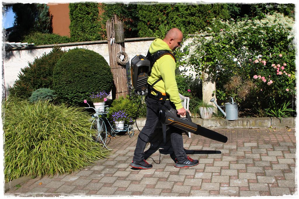 Dmuchawa – jak to w ogrodzie, często trzeba coś przedmuchać, wydmuchać, pozamiatać. Owszem można zwykłą miotłą, ale można też korzystać ze zdobyczy techniki. Więc są takie, właśnie dmuchawy. Więc może być na przykład taka kompatybilna ze wspomnianym systemem plecakowym,