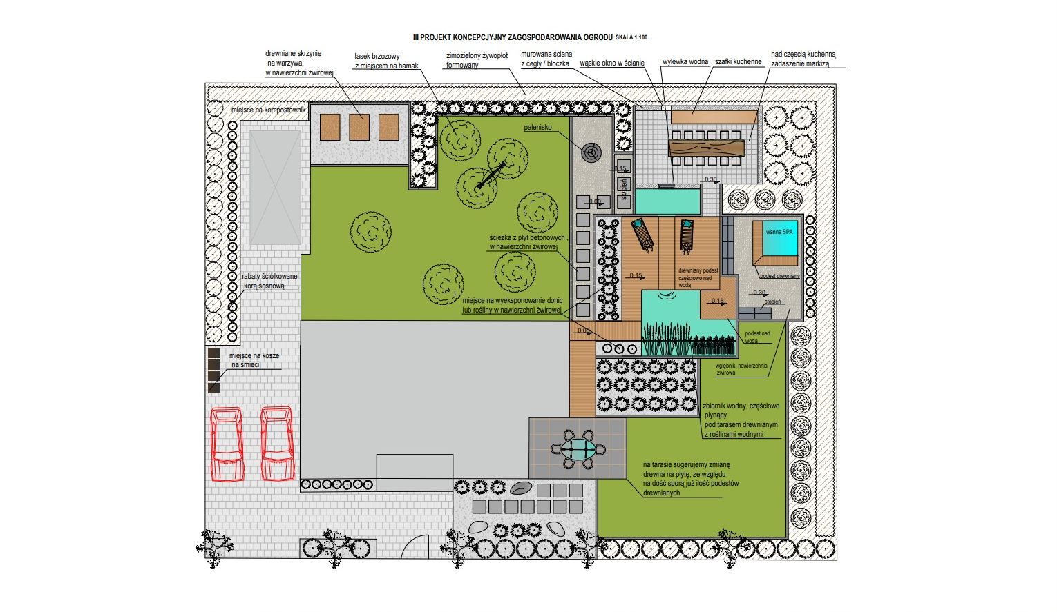 Rzut szczegółowy do wybranej wersji z proponowanym doborem gatunków roślin oraz materiałów oraz specyfikacja/przedmiar.