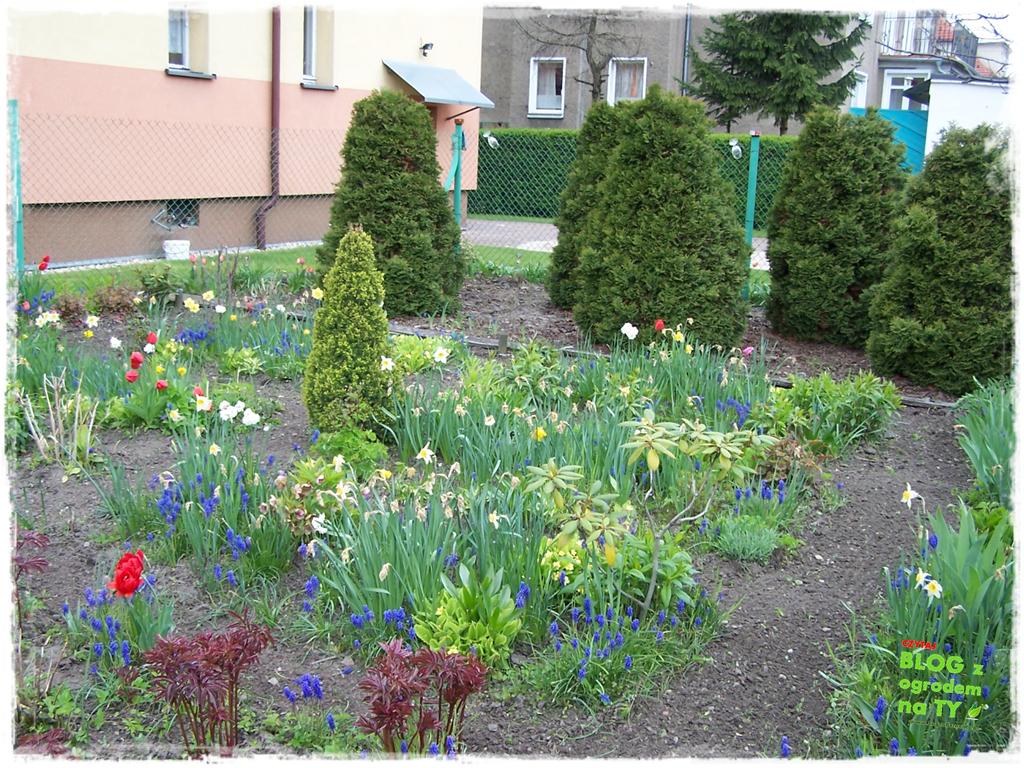 Rabaty kwiatowe. Ale takie po babcinemu. Goła ziemia i tu kwiatek, tam kwiatek i tam jeszcze jeden kwiatek.