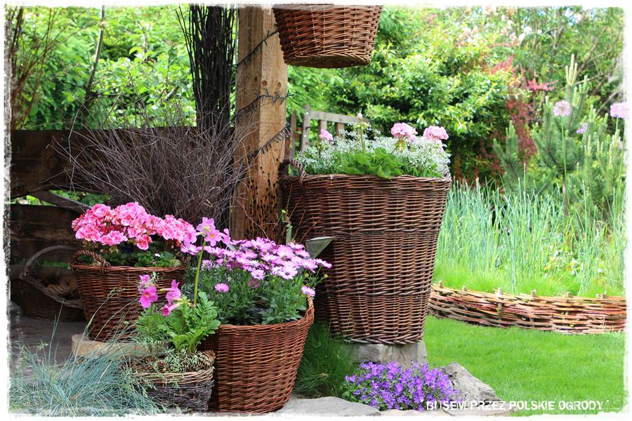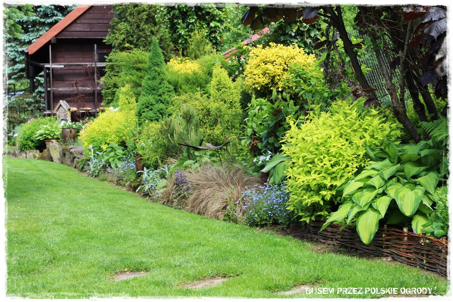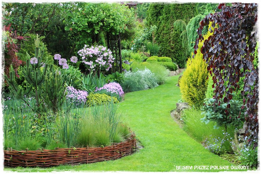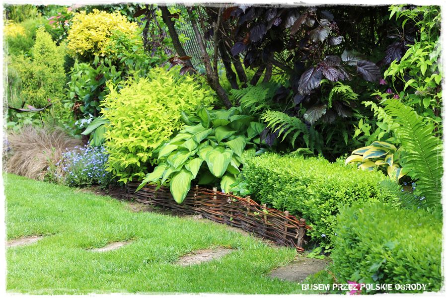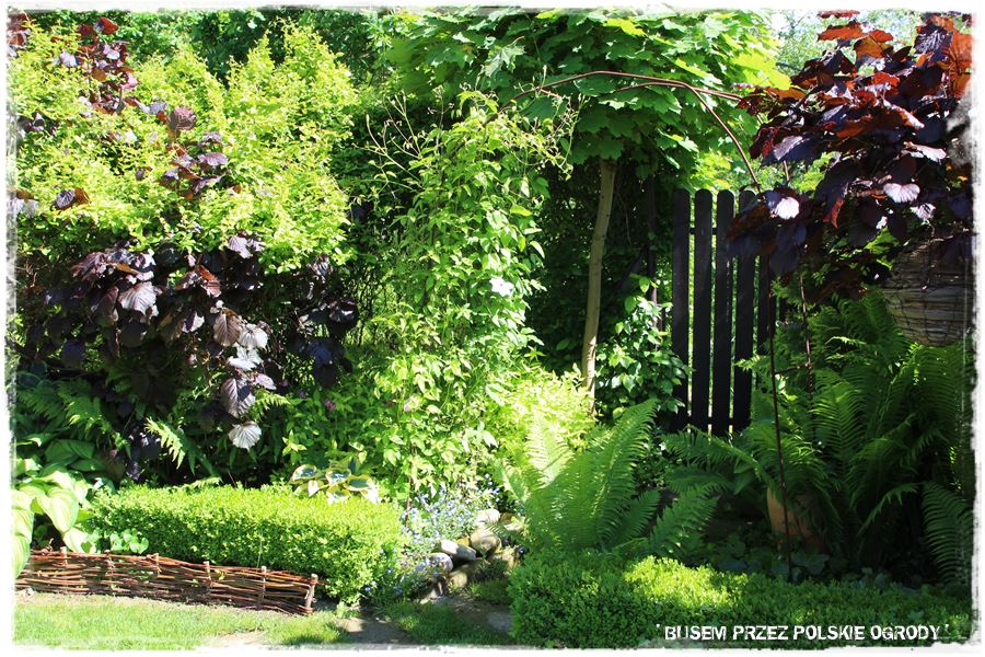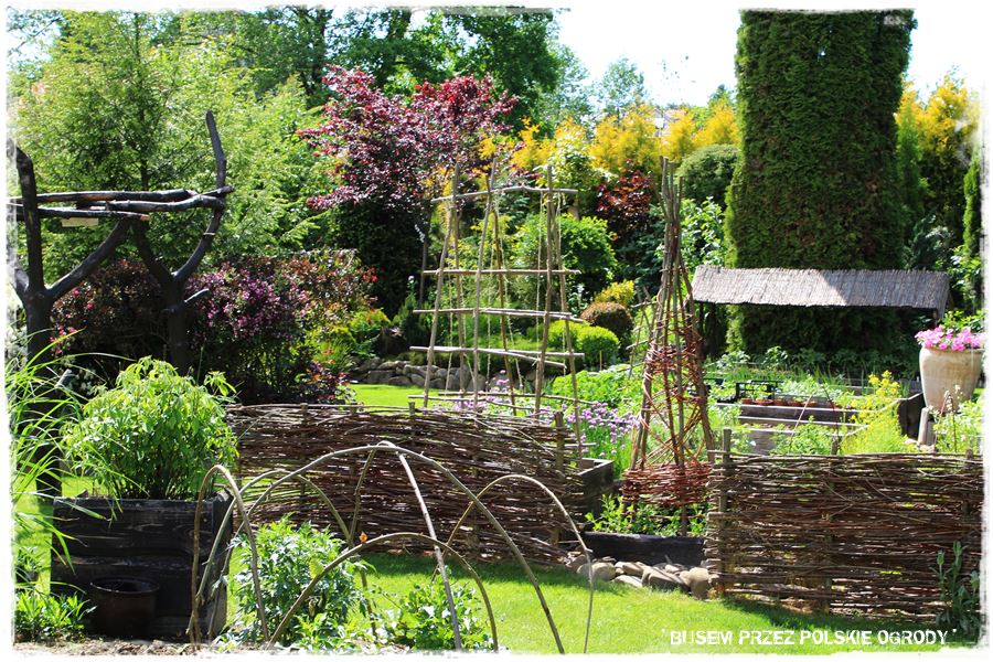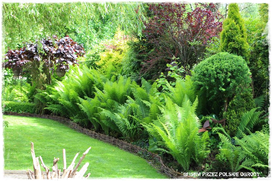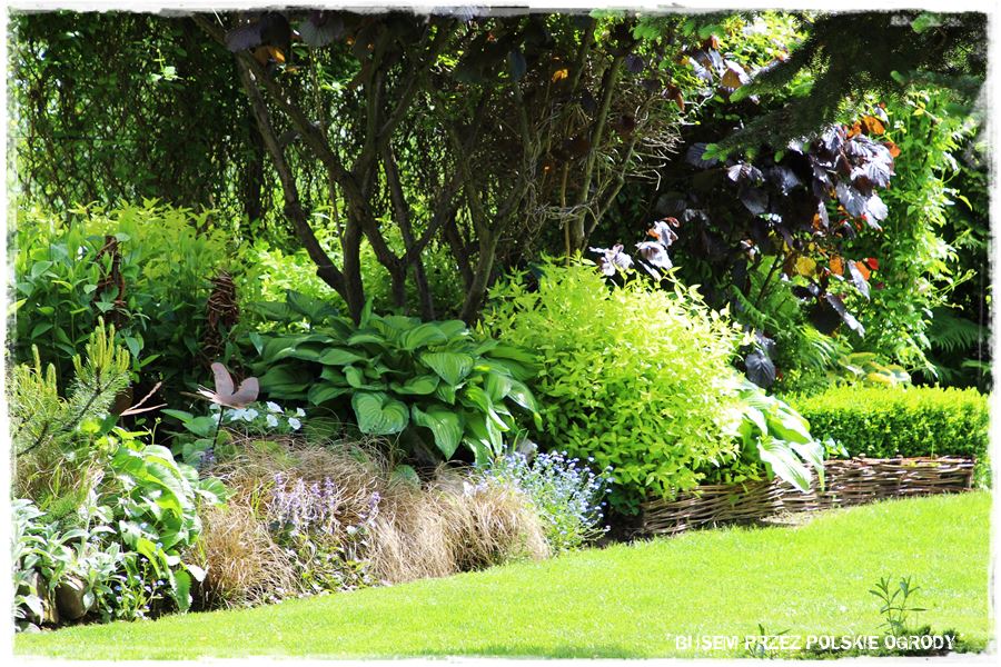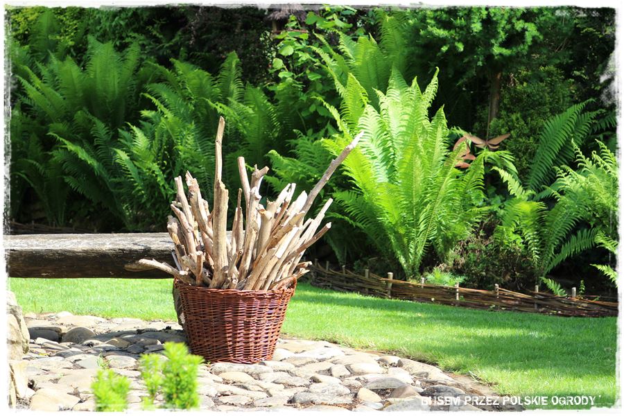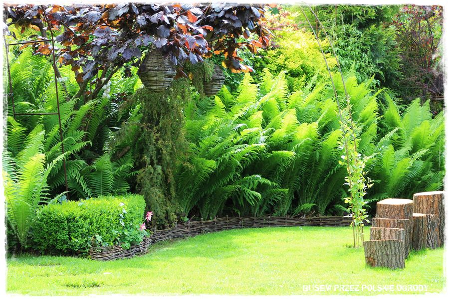 A wszystko przez specyficzny mikroklimat, który wprowadza otaczająca ogród, z dwóch stron, rzeczka i pobliskie mokradła. Natomiast spójrz również na wiklinowe płotki przy paprociach, które nawiasem mówiąc zdobią także inne rabaty,