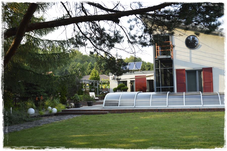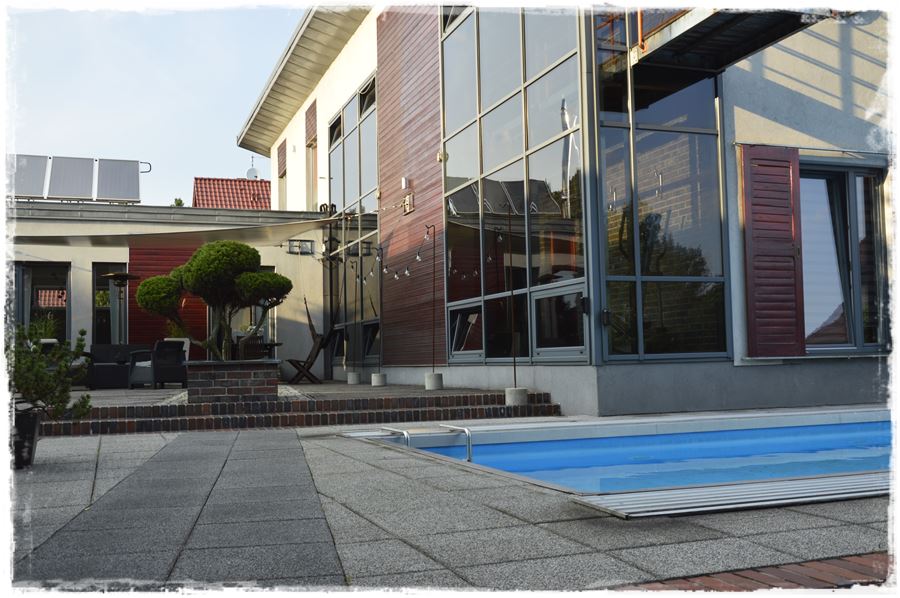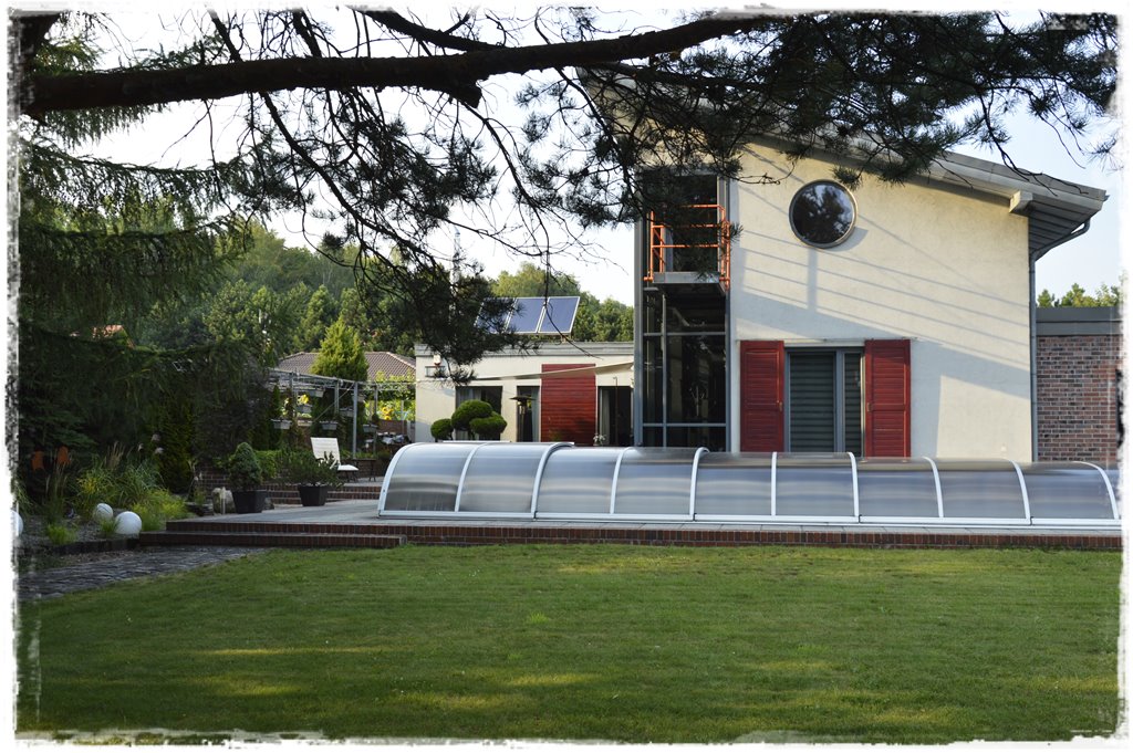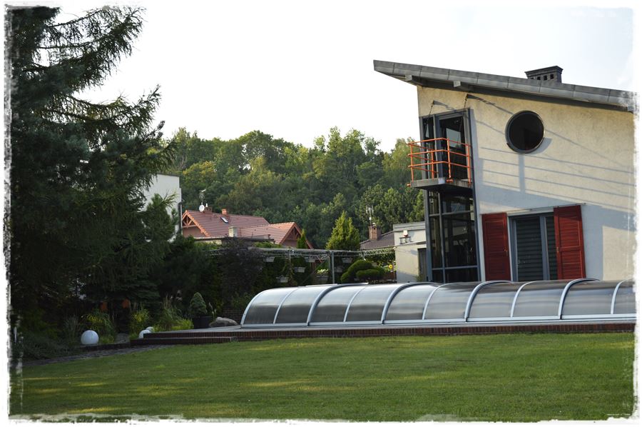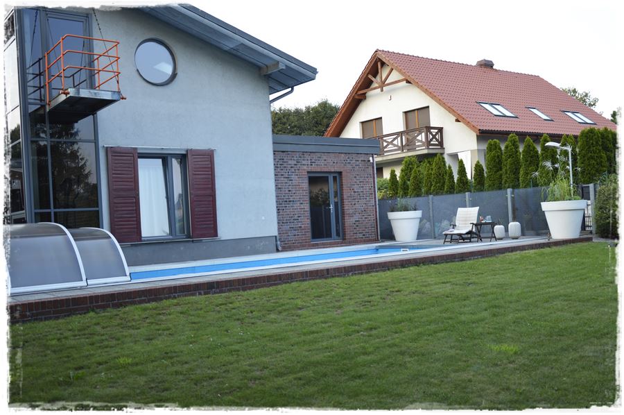 Przy domu zbudowano również basen z przesuwnym zadaszeniem z poliwęglanu.