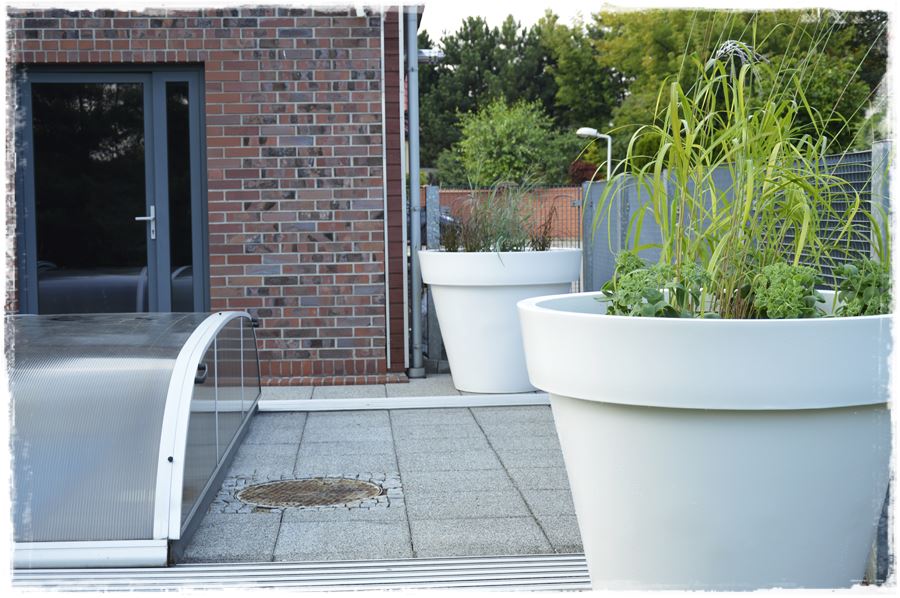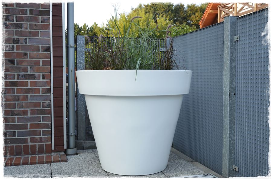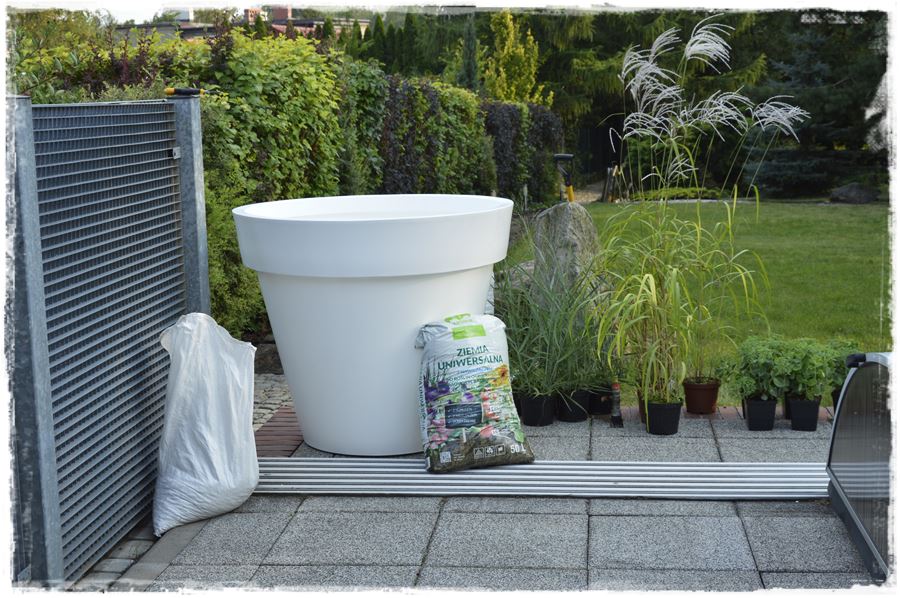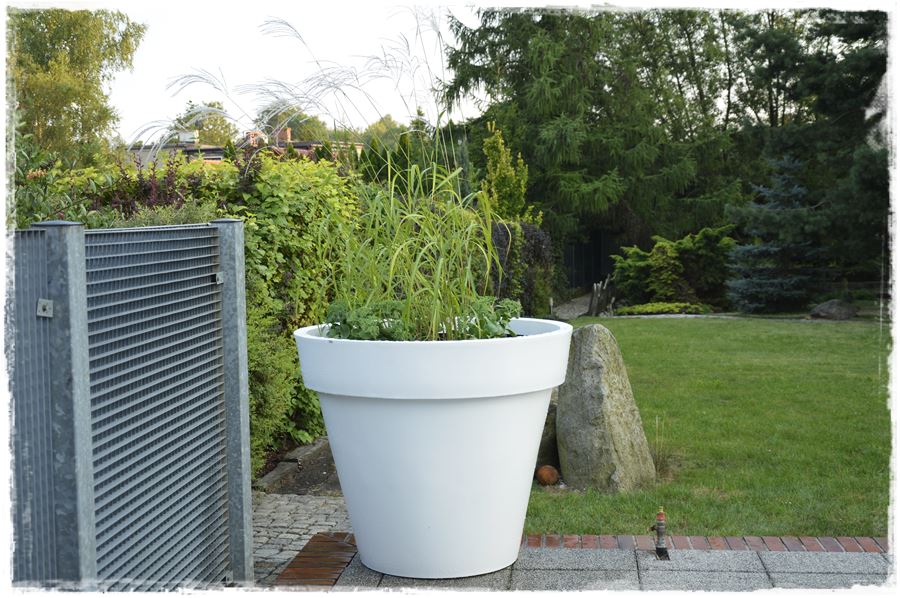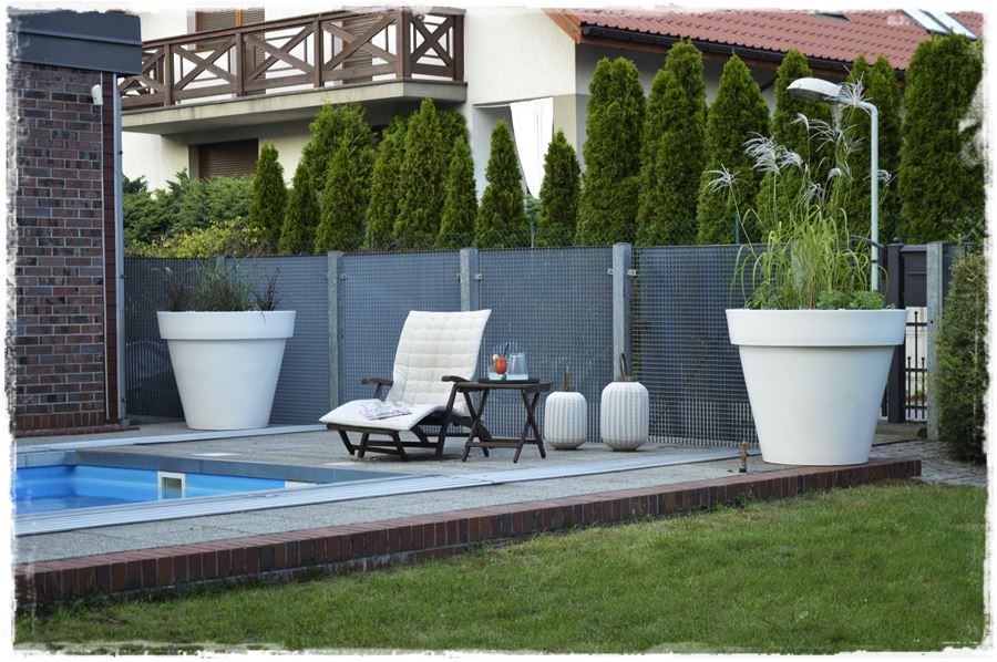 Te wielkie, klasyczne, ogrodowe donice produkowane są z myślą o bardzo dużych roślinach, czy nawet drzewach. Duża pojemność – 482 litrów gwarantuje wysoką stabilność konstrukcji, a roślinom zapewnia dużo miejsca na korzenie. Jednak w tym przypadku, z uwagi na bezpośrednie sąsiedztwo basenu, zrezygnowaliśmy z posadzenia w nich drzew, choć ta opcja wydawała się bardzo atrakcyjna. Postawiliśmy więc na prostą, elegancką kompozycję, głownie z traw ozdobnych, które miały uzupełniać kompozycje z traw na rabatach.