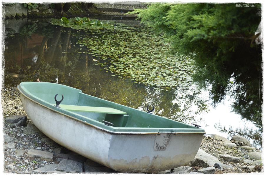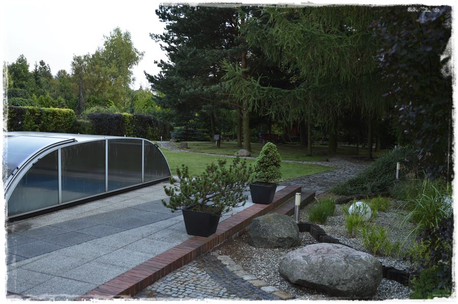 Do basenu przylega rozległy trawnik, który przecina granitowa ścieżka, łącząca z drugą, naturalistyczną częścią ogrodu, z wspomnianym stawem oraz zbudowanym w narożniku drewnianym domkiem, w którym mieści się sauna.