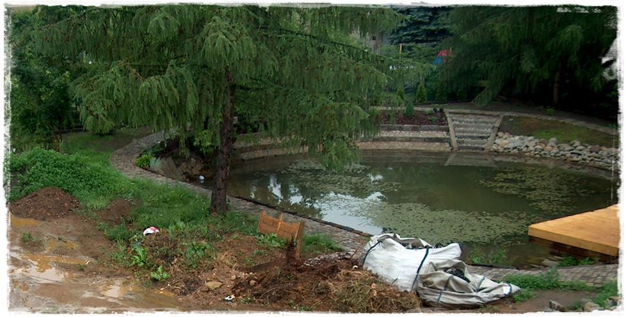 Pozostawiono również w prawie niezmienionym kształcie znajdujący się tuż za laskiem naturalny staw. Jednak zarośnięty i zanieczyszczony pierwotnie zbiornik, został doprowadzony do użyteczności i zagospodarowany w bardzo atrakcyjny sposób. Poniżej w trakcie prac,