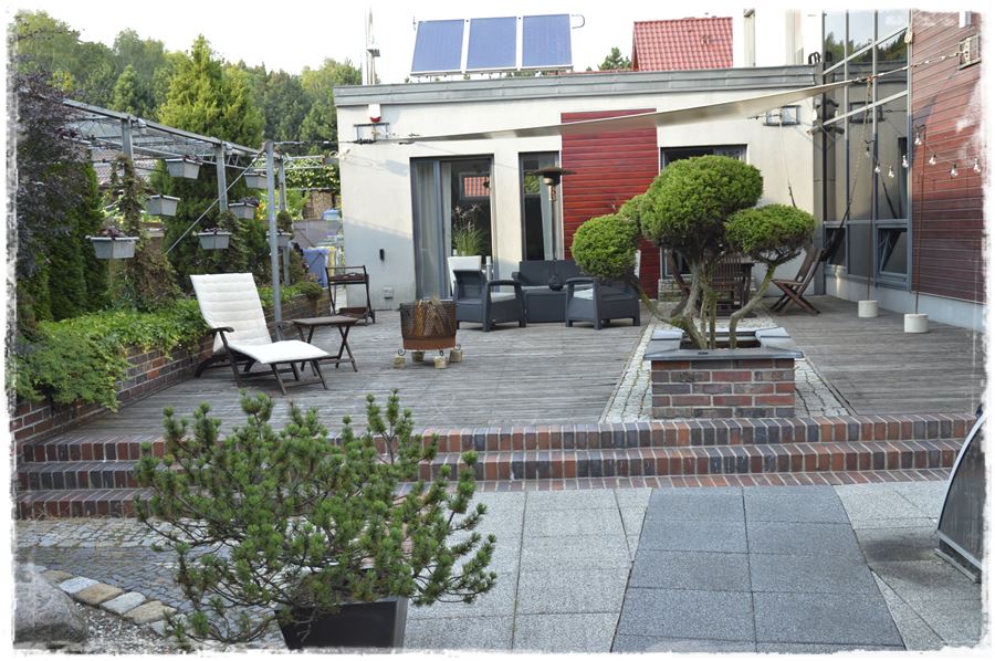 Do oszklonej ściany przylega ogromny, również bardzo nowocześnie zaaranżowany taras, wyłożony deską modrzewiową, ze ścieżką z kostki granitowej. Wkomponowane są w to murowane donice wykończone klinkierem, a dodatkowo w sąsiedztwie ustawiono białe, podświetlane, w których rosną chińskie miskanty. Z kolei w jednej z murowanych znalazło się miejsce dla solitera w postaci strzyżonego w formie bonzai jałowca.