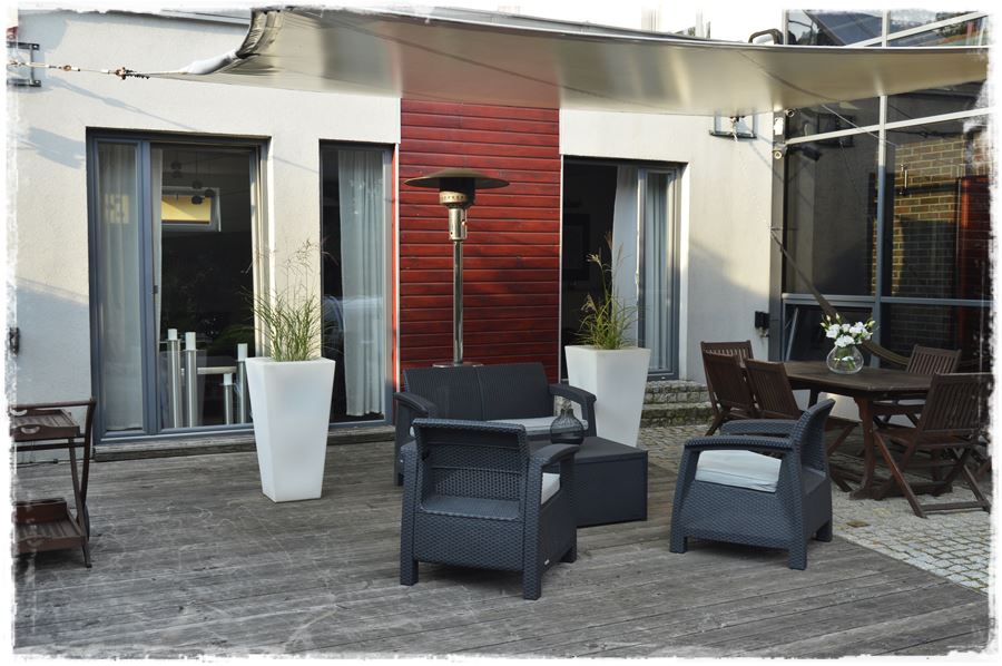 Taras przed słońcem częściowo osłania nowoczesny żagiel, który rozpostarty jest nad częścią wypoczynkową.