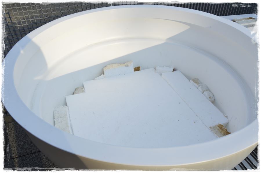 Z uwagi na wybór roślin, które nie mają dużej bryły korzeniowej i nie potrzebują dużej pojemność donic, chcąc ograniczyć ilość potrzebnej do wypełnienia ziemi, donice do połowy wysokości zostały wyłożone kawałkami styropianu,