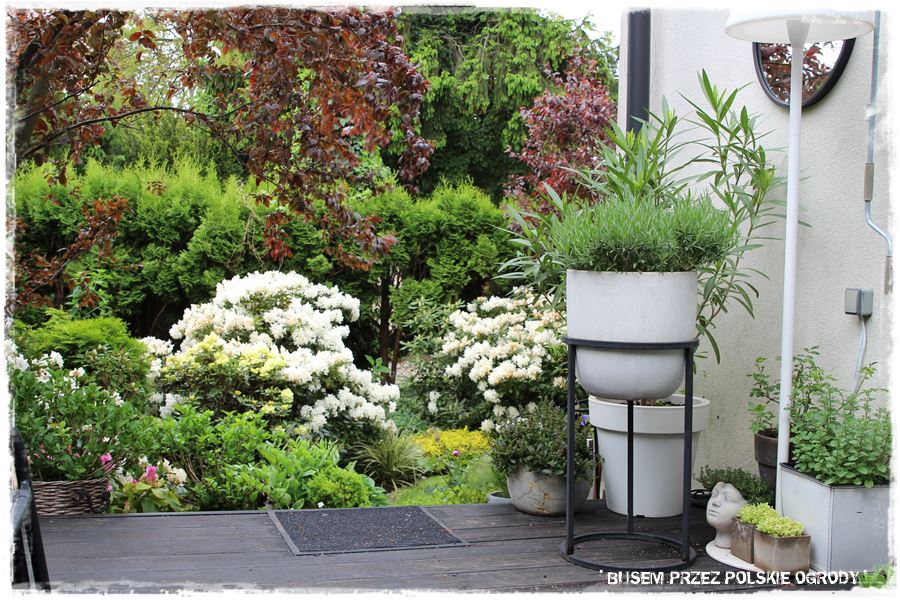 Natomiast o tej porze roku, pięknie wyglądają zimozielone, kwitnące rododendrony, które bardzo dobrze wpisują się w te wszystkie dobrane aranżacje.