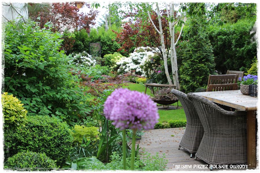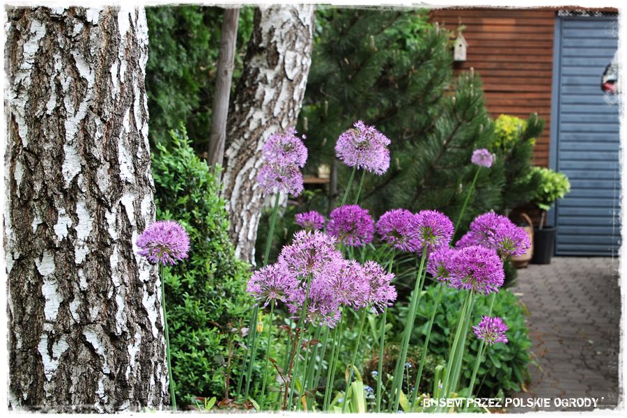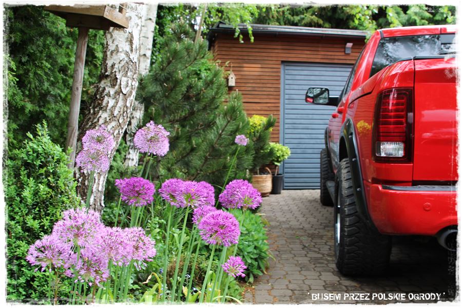 Wracając na moment do roślin. Wspomniałem o kilku odmianach przy tarasie, takich jak kocimiętka, szałwia omszona czy lawenda, które kwitnąc, mają zdecydowanie fioletowy kolor. I to jest właśnie ulubiony kolor właścicielki ogrodu, w który wpisują się również czosnki ozdobne,