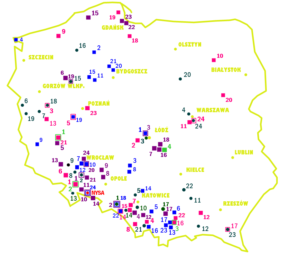 niebieskie kwadraty z numerami od 1 do 24, które obrazują wszystkie ogrody odwiedzone w sezonie 2 – 2019