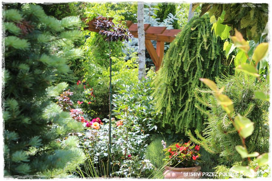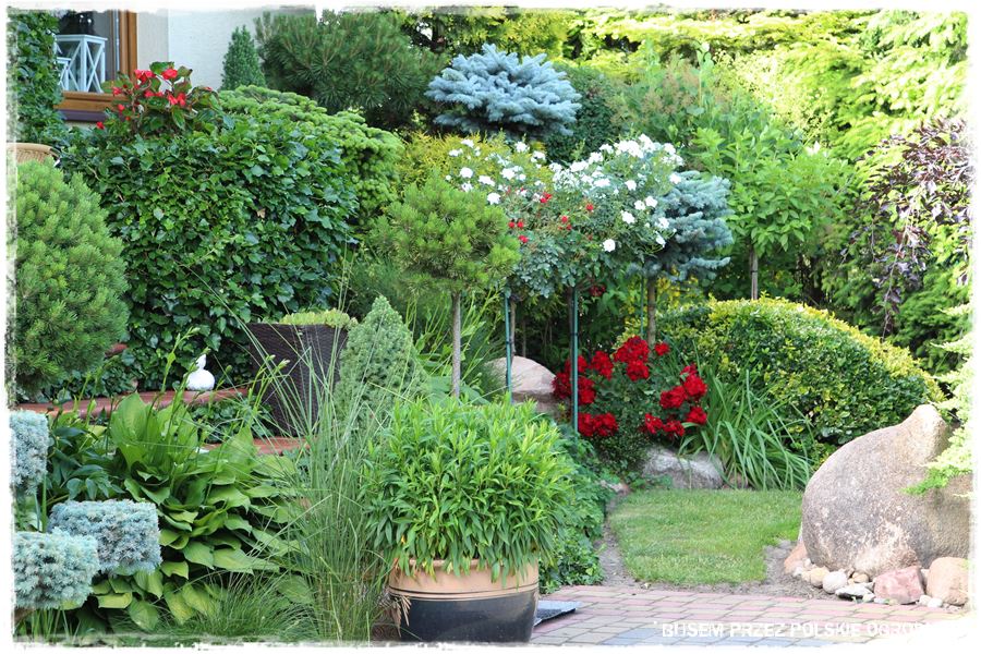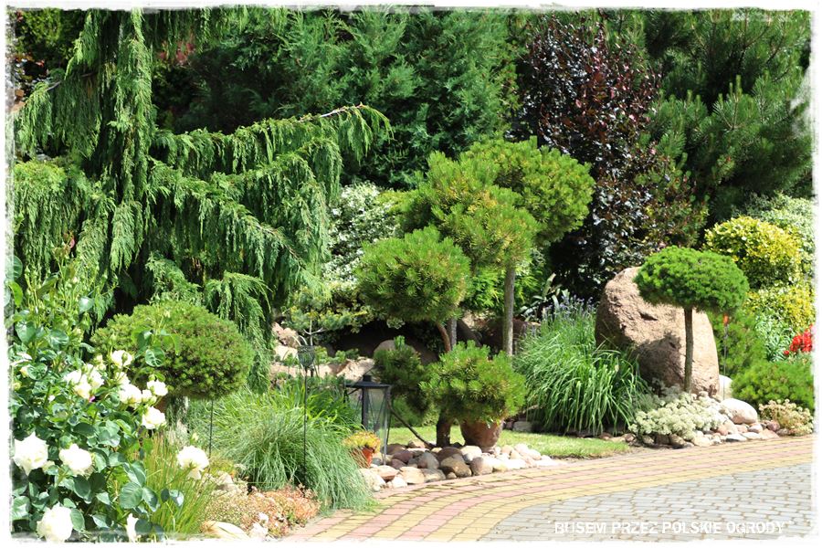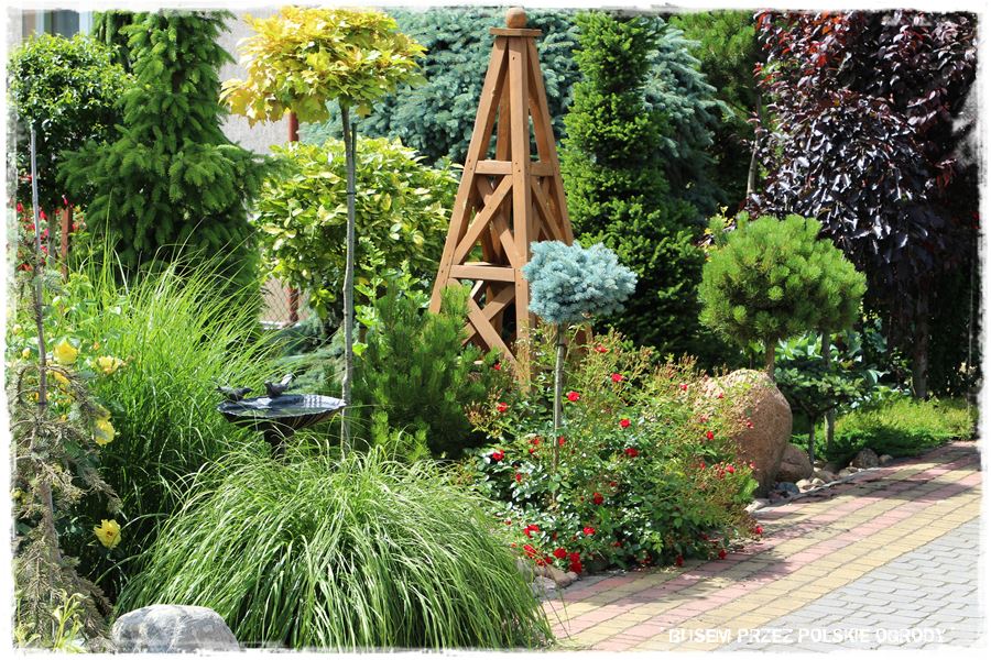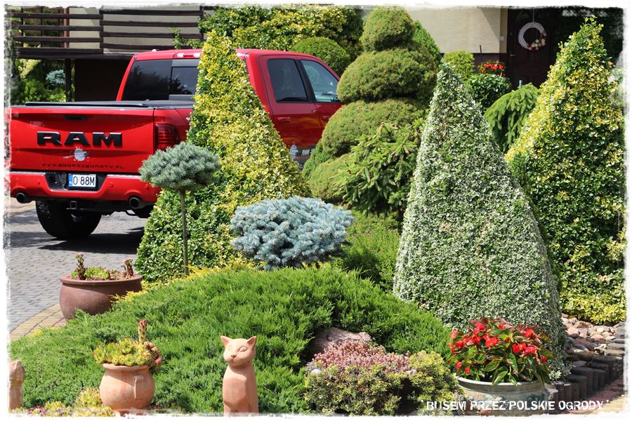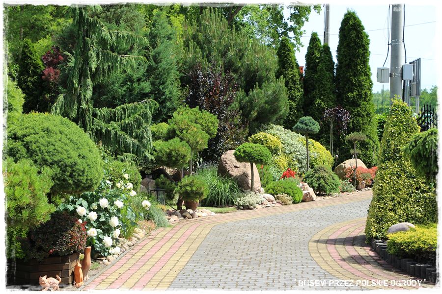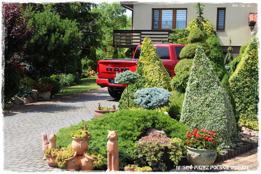 I kończąc powoli spacer po tym miejscu, wracam do części frontowej, czyli drugiej, nieco innej części tego ogrodu. Obszarowo podobnej do tylnej, natomiast nieco inaczej zaaranżowanej. Również dominują tu gęsto obsadzone rabaty, natomiast już nie tak bujne i tajemnicze. Za to z mnóstwem miniaturowych iglaków i formowanych roślin.