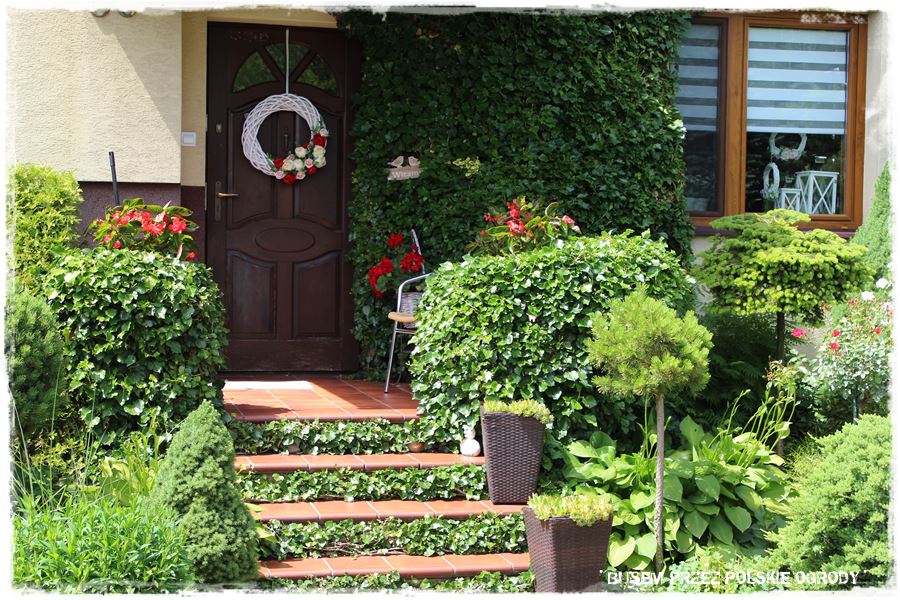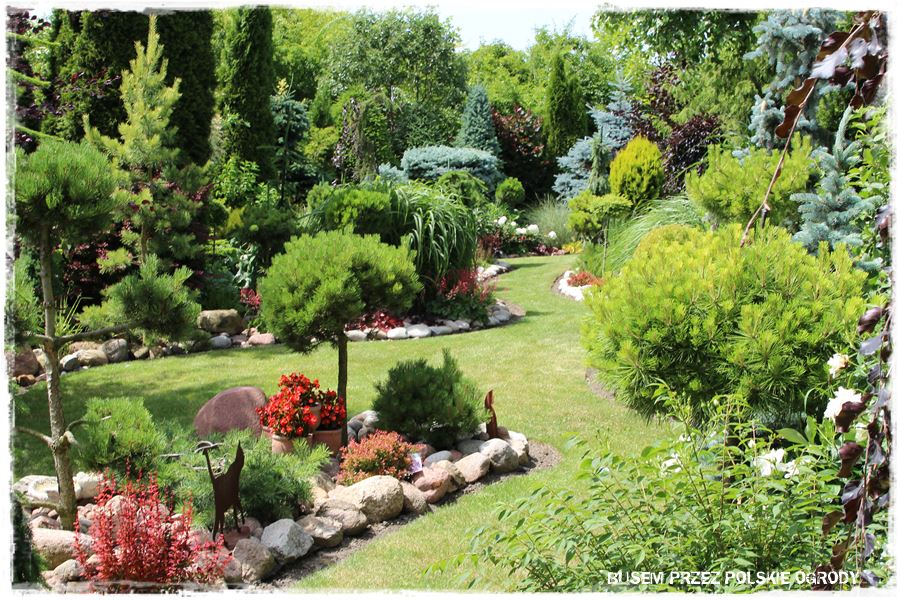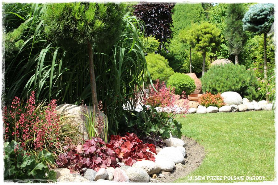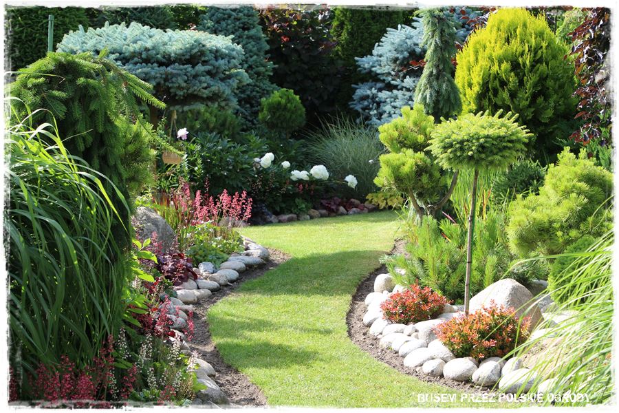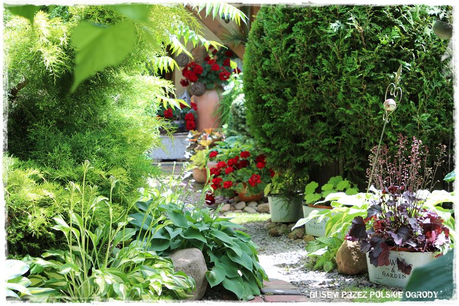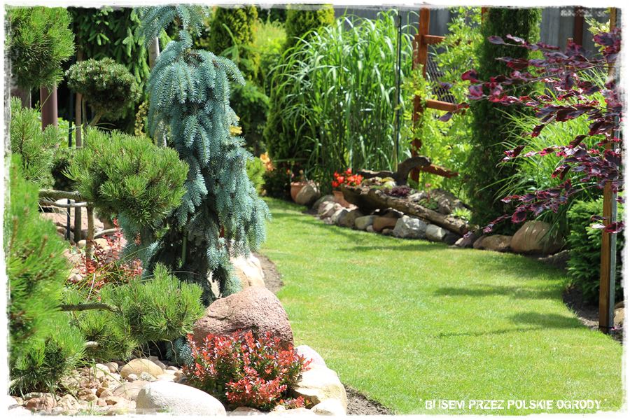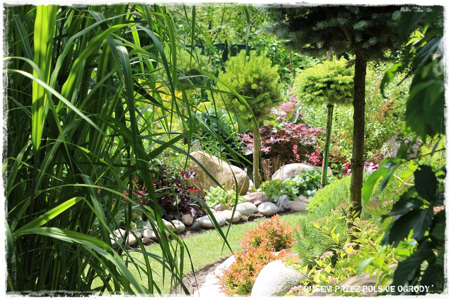 I kończąc powoli spacer po tym miejscu, wracam do części frontowej, czyli drugiej, nieco innej części tego ogrodu. Obszarowo podobnej do tylnej, natomiast nieco inaczej zaaranżowanej. Również dominują tu gęsto obsadzone rabaty, natomiast już nie tak bujne i tajemnicze. Za to z mnóstwem miniaturowych iglaków i formowanych roślin.
