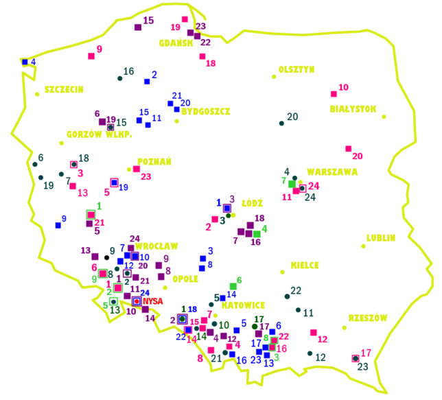Kolor czerwony to tradycyjnie miejsce skąd wyruszyłem, a ten jasnozielony kwadrat z numerem 9, to właśnie lokalizacja dziewiątego ogrodu, położonego w województwie dolnośląskim. Do pokonania miałem zatem niewielką odległość, około 100 kilometrów w jedną stronę. Na mapie widać również: