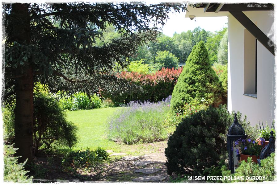 Ale na największą uwagę zasługuje ścieżka, czyli taki chodnik prowadzący od frontu posesji, z boku budynku, na tył, którą dochodzi się do właściwego ogrodu. Ścieżka biegnie pod brzozową pergolą i prowadzi do tego niezwykłego ogrodu, który otwiera widok na staw kąpielowy.