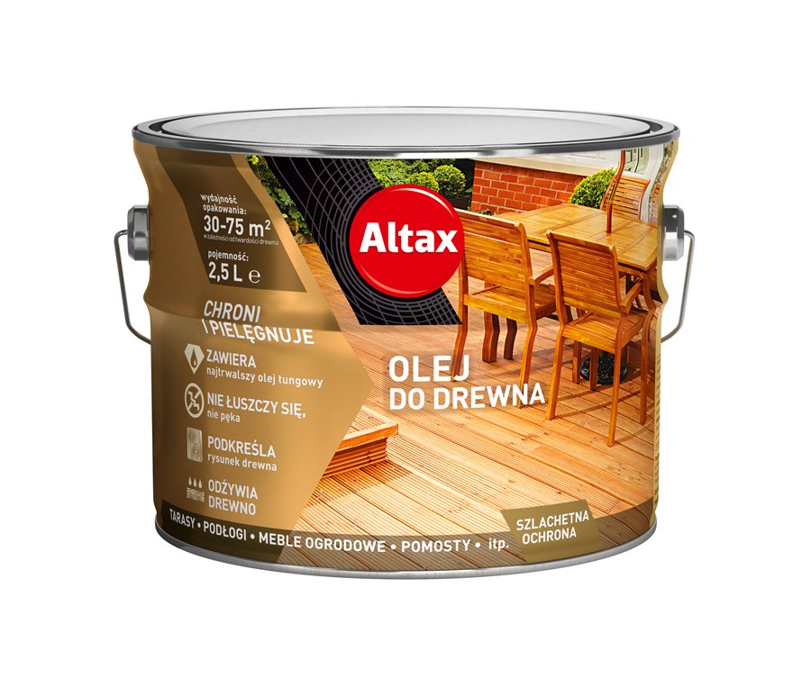 Olej rekomendowany jest w szczególności do zabezpieczania drewna egzotycznego i twardego drewna krajowego. Podkreśla naturalne piękno i rysunek drewna. Olej do drewna marki Altax zawiera olej tungowy – najtrwalszy olej naturalny na świecie, który dodatkowo wzmacnia ochronę przed czynnikami zewnętrznymi (deszczem, śniegiem, mrozem, promieniowaniem UV). Chroni drewno przed nadmiernym rozsychaniem i pękaniem, nie łuszczy się i nie pęka.