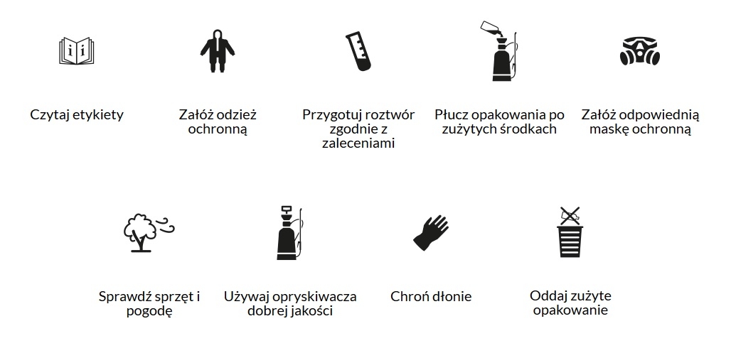 Dodatkowo podczas pracy ze środkami ochrony roślin zawsze miej w pobliżu czystą wodę. W przypadku kontaktu środka ze skórą zdejmij poplamioną odzież i natychmiast dokładnie przemyj skórę wodą i mydłem. Jeśli środek dostał się do oczu, przemywaj je przez co najmniej 10 minut z użyciem czystej bieżącej wody. Następnie skontaktuj się z lekarzem. W przypadku połknięcia natychmiast skonsultuj się z lekarzem. Nie wywołuj wymiotów! W razie wypadku lub złego samopoczucia szybkość działania jest bardzo istotna. Gdy tylko poczujesz się źle natychmiast udaj się do lekarza. Pamiętaj, że nie wolno Ci nic pić, jeść, ani palić papierosów. Zabierz ze sobą opakowanie preparatu lub zdjęcie etykiety, gdyż zawiera ona informacje potrzebne do prawidłowego leczenia.