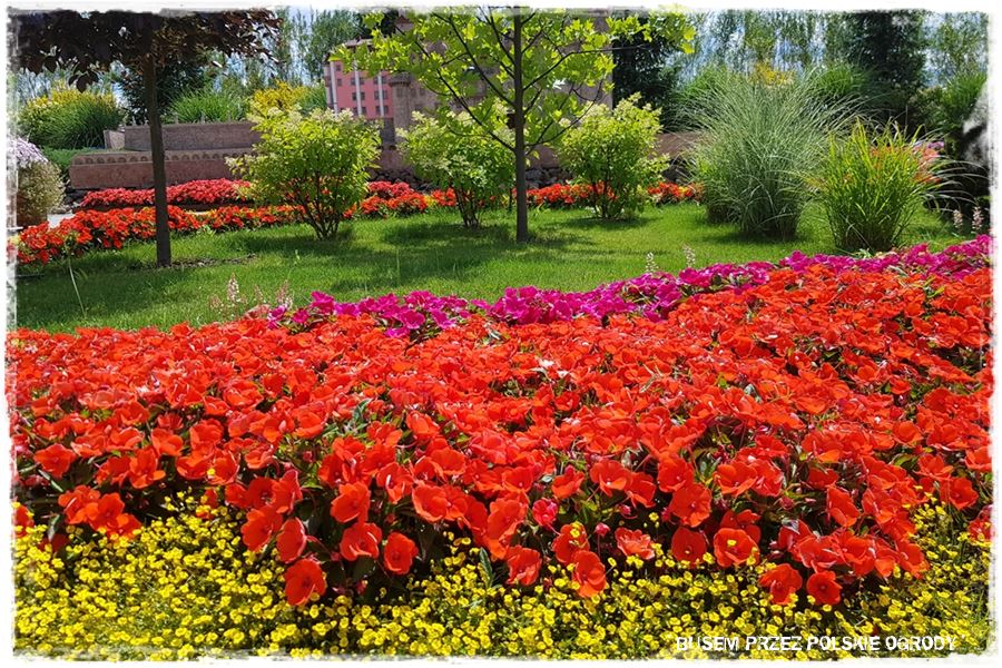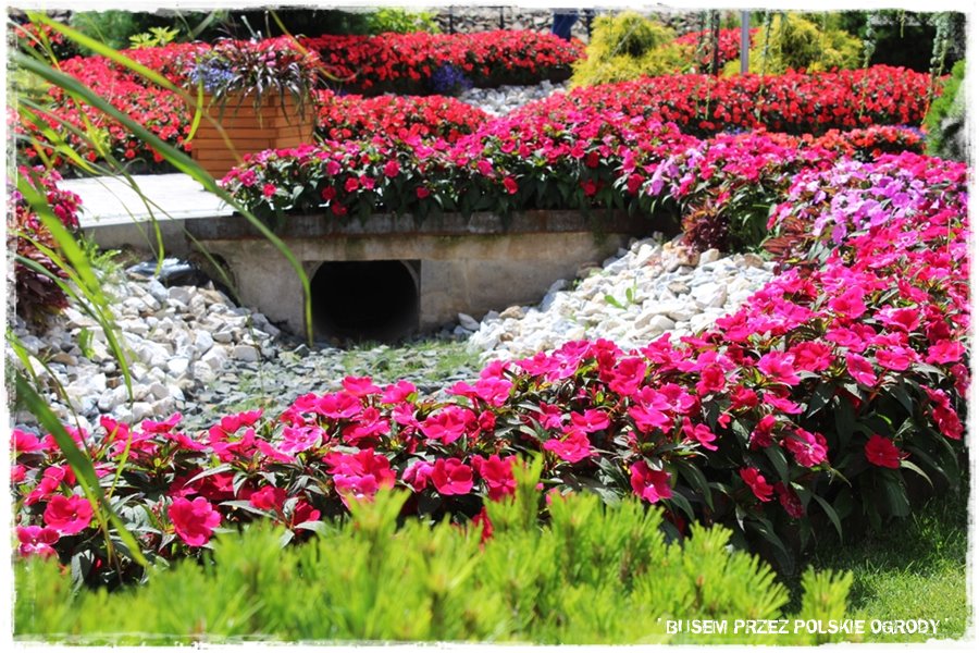 To co w tym ogrodzie jako pierwsze rzuca się w oczy i zdecydowanie wychodzi na pierwszy plan, to niesamowite kolory i ogromne połacie kwietnych kompozycji. Pięknie wpisane w ukształtowanie terenu oraz skomponowane z roślinami wieloletnimi i trawnikami oraz elementami architektury. Królują w nich niecierpki, co jeszcze bardziej podkreśla fakt, jak perfekcyjnie teren jest utrzymywany. Jak mówi sam właściciel, niecierpek bez wody „udaje trupa“, co w wolnym tłumaczeniu oznacza, że zwyczajnie nie wygląda dobrze. Tymczasem tutaj, wszystko prezentuje się kwitnąco.
