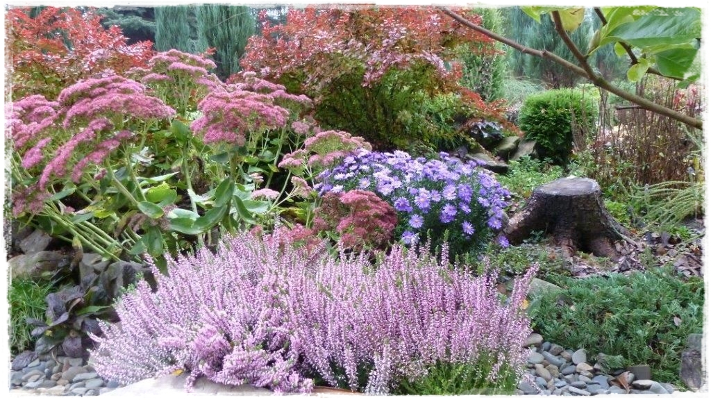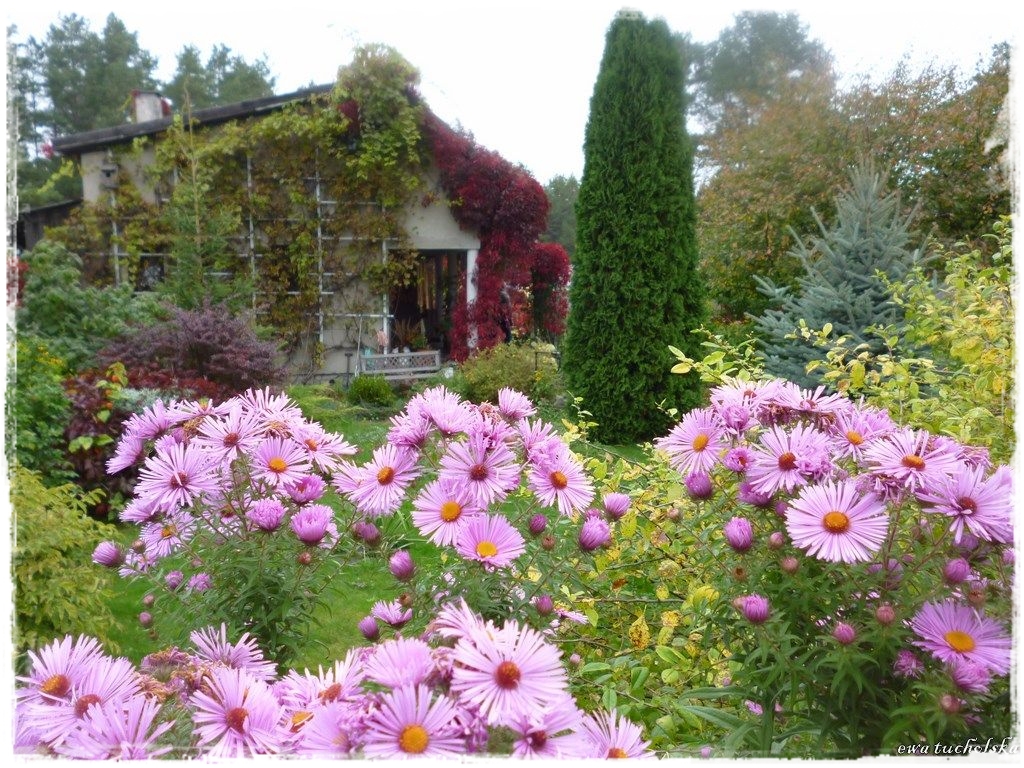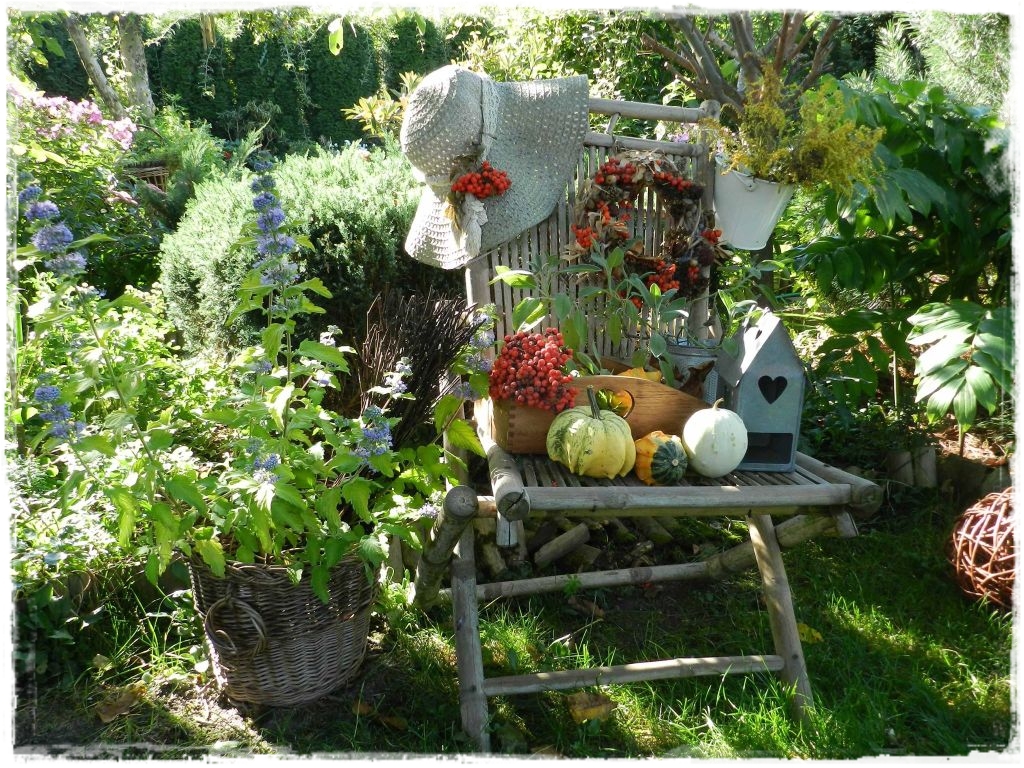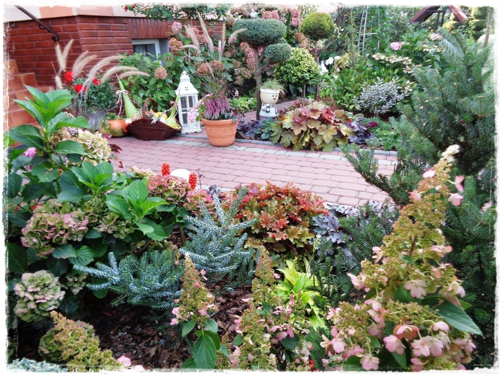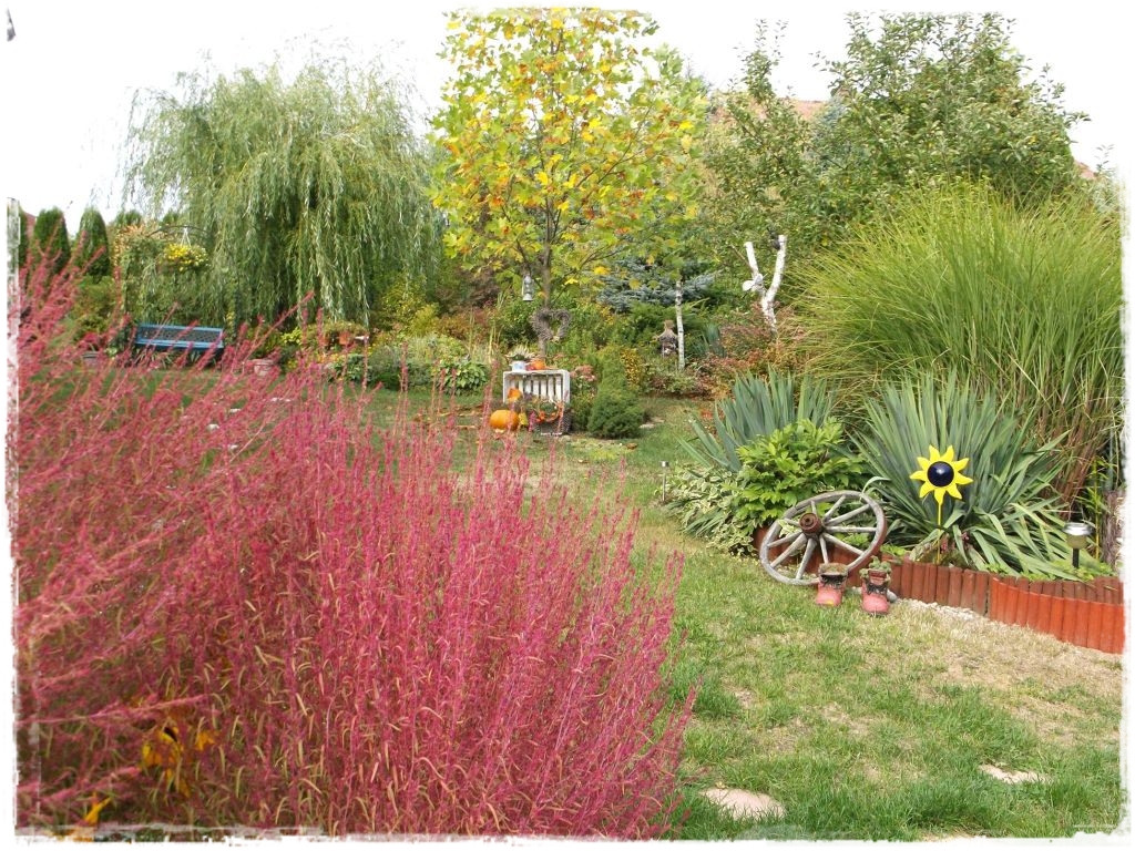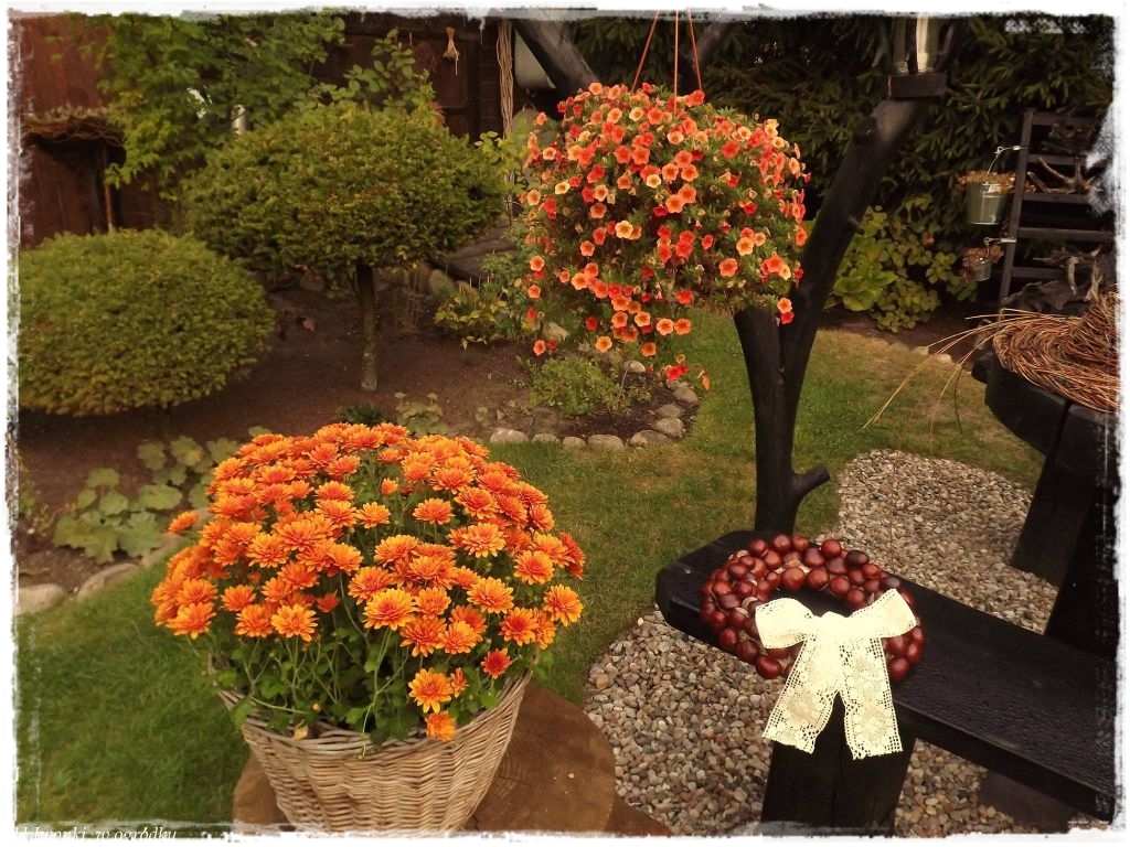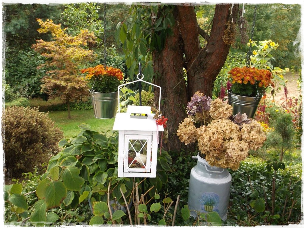 Wielopoziomowy i bardzo kolorowy ogród. Mnóstwo kwiatów i różnorodność gatunków. Na naturalnych spadkach terenu wszystko pięknie się układa tworząc różnokolorowe piętra. To sprawia, że jesień wyjątkowo ładnie się tam komponuje. Oczywiście także dodatki, dekoracje. które jakby przypadkiem znajdują się praktycznie w każdym możliwym miejscu.