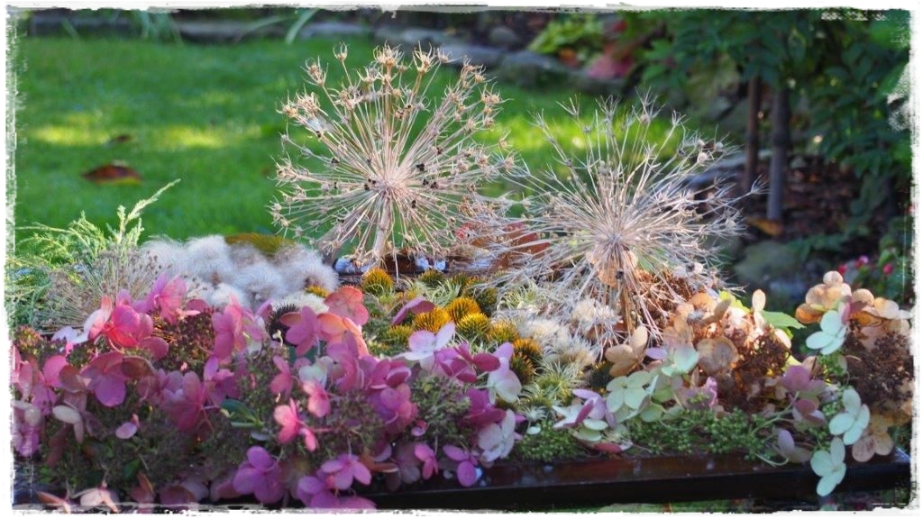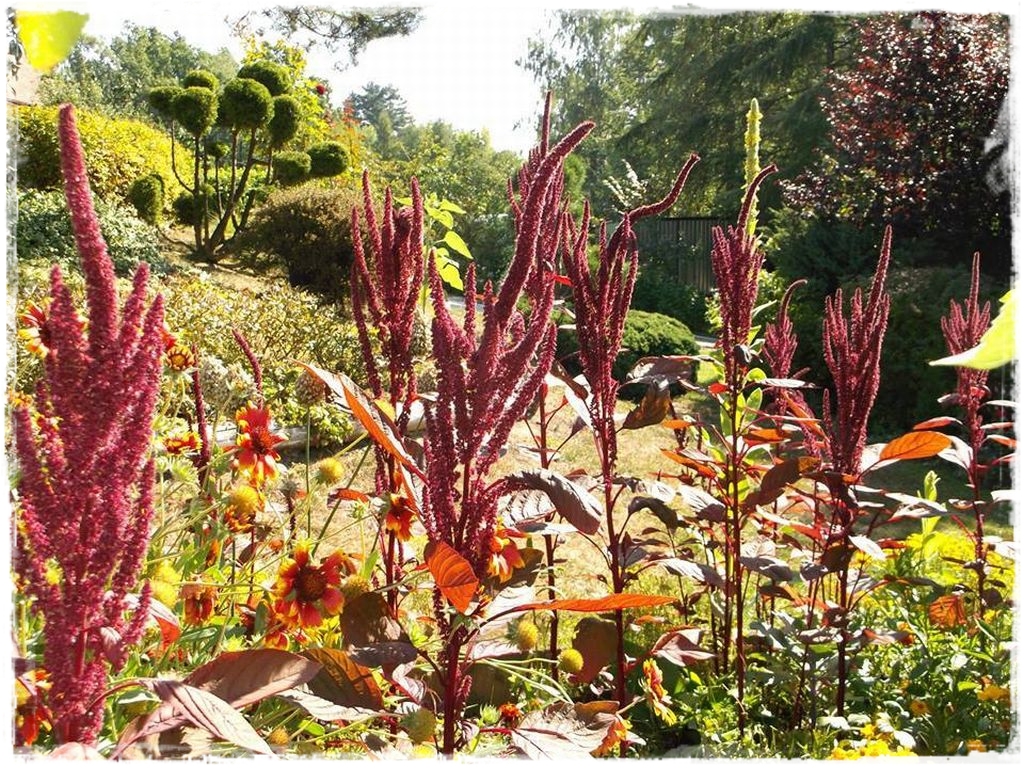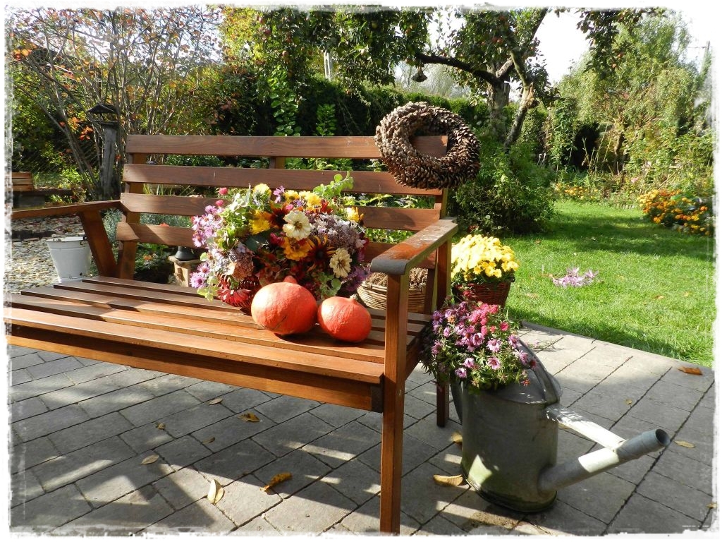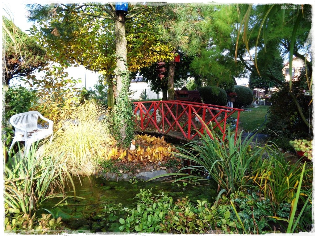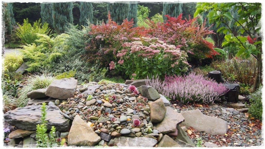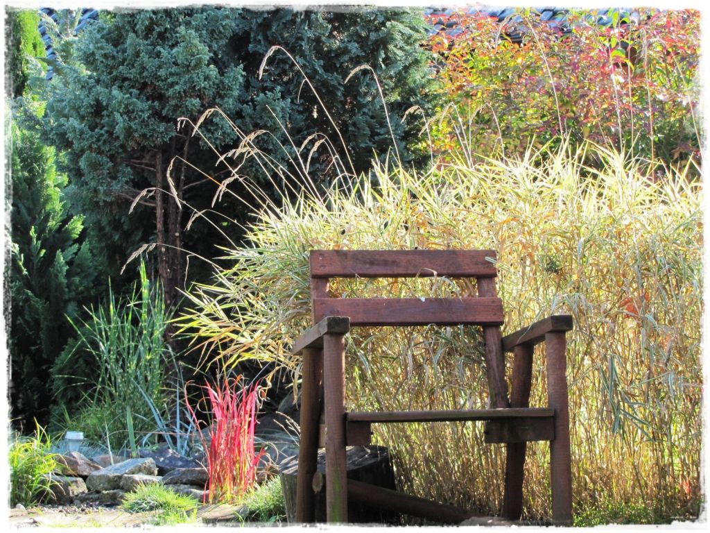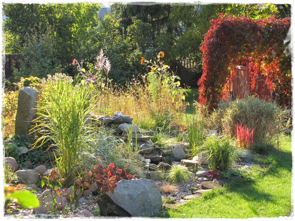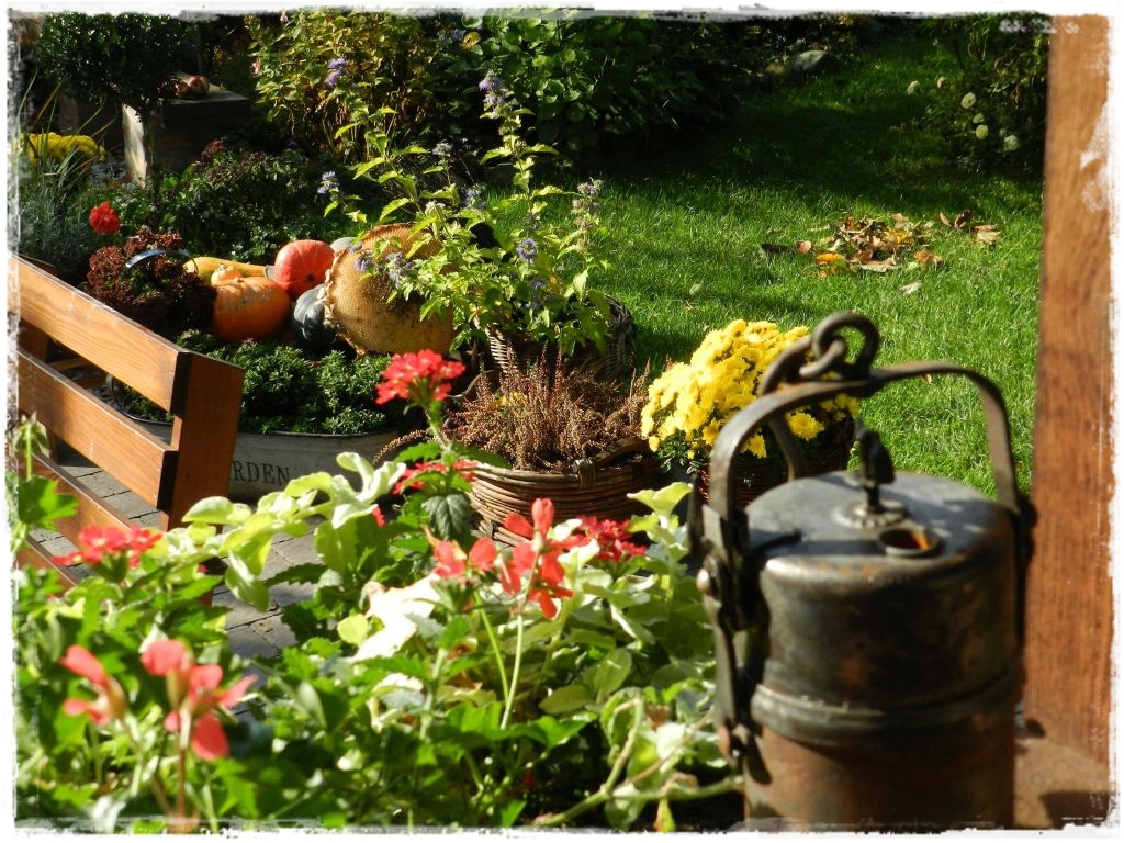 Wielopoziomowy i bardzo kolorowy ogród. Mnóstwo kwiatów i różnorodność gatunków. Na naturalnych spadkach terenu wszystko pięknie się układa tworząc różnokolorowe piętra. To sprawia, że jesień wyjątkowo ładnie się tam komponuje. Oczywiście także dodatki, dekoracje. które jakby przypadkiem znajdują się praktycznie w każdym możliwym miejscu.