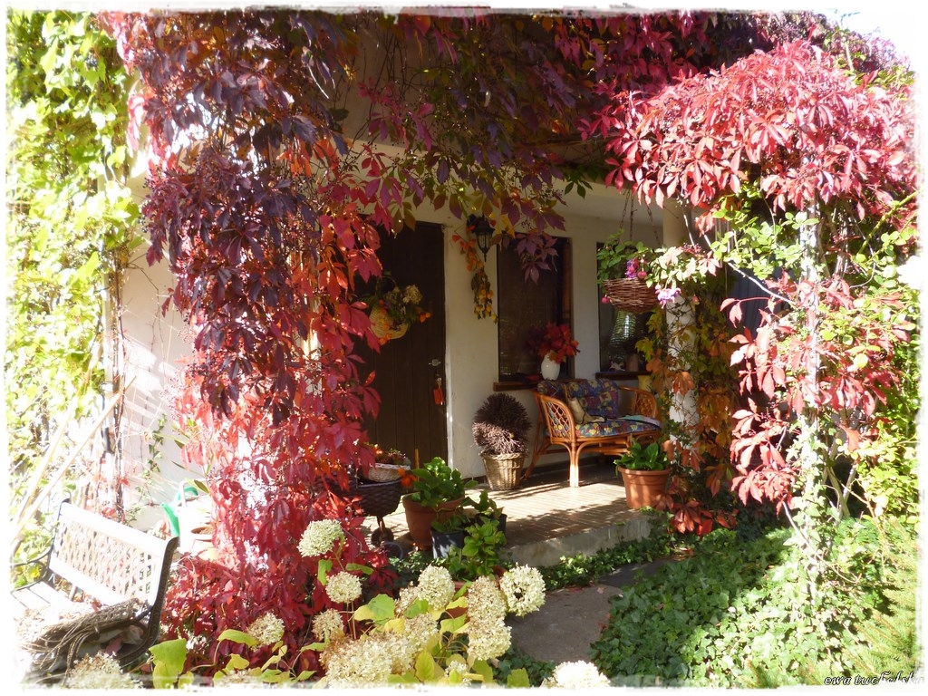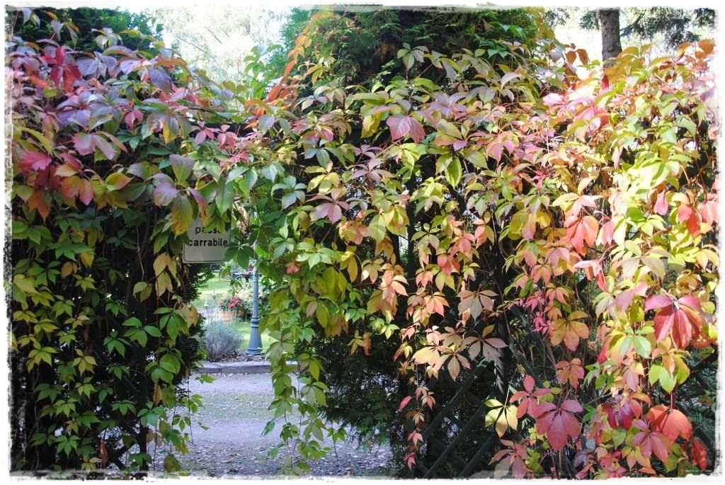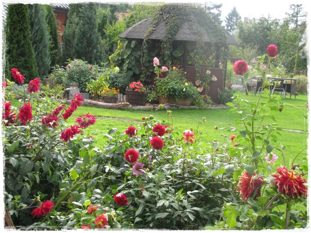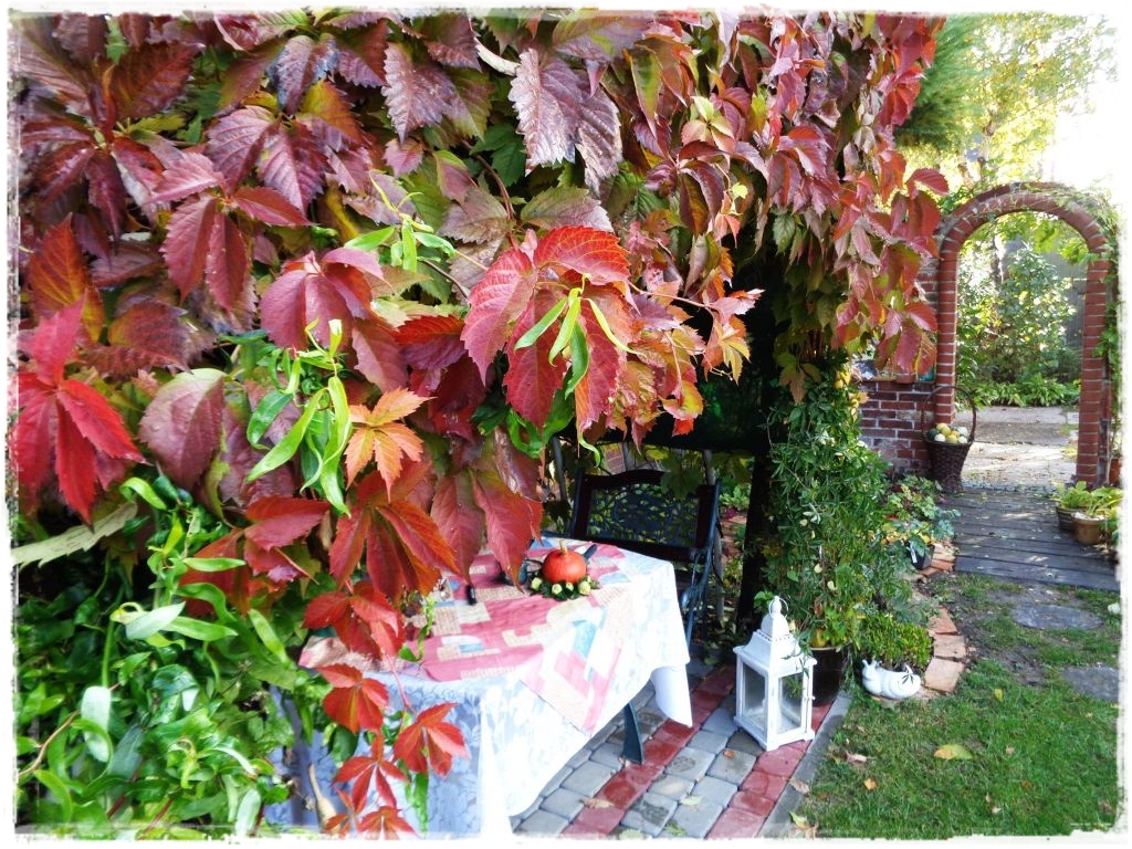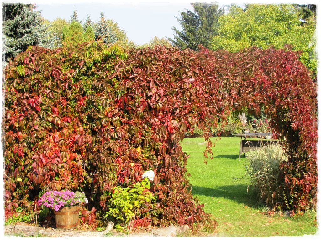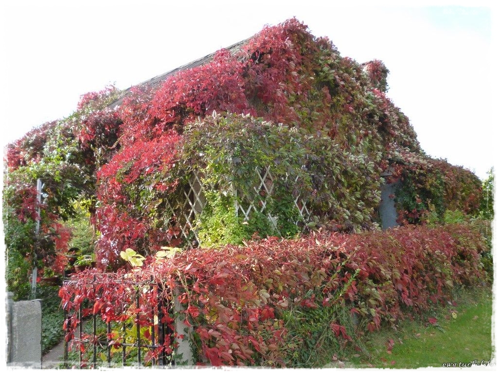 Ogród inny niż pozostałe bo to ogród działkowy. Czyli nie ogród, a właściwie działka. Ale żadnych warzyw nie ma się co tutaj spodziewać i dlatego śmiało można go zakwalifikować do kategorii ogrodów. Mnóstwo pięknych kwiatów, a przede wszystkim pnączy. Nawet ściany i dach budynku wyglądają jak jedna wielka zielona kopuła. A jesienią oczywiście bordowa.