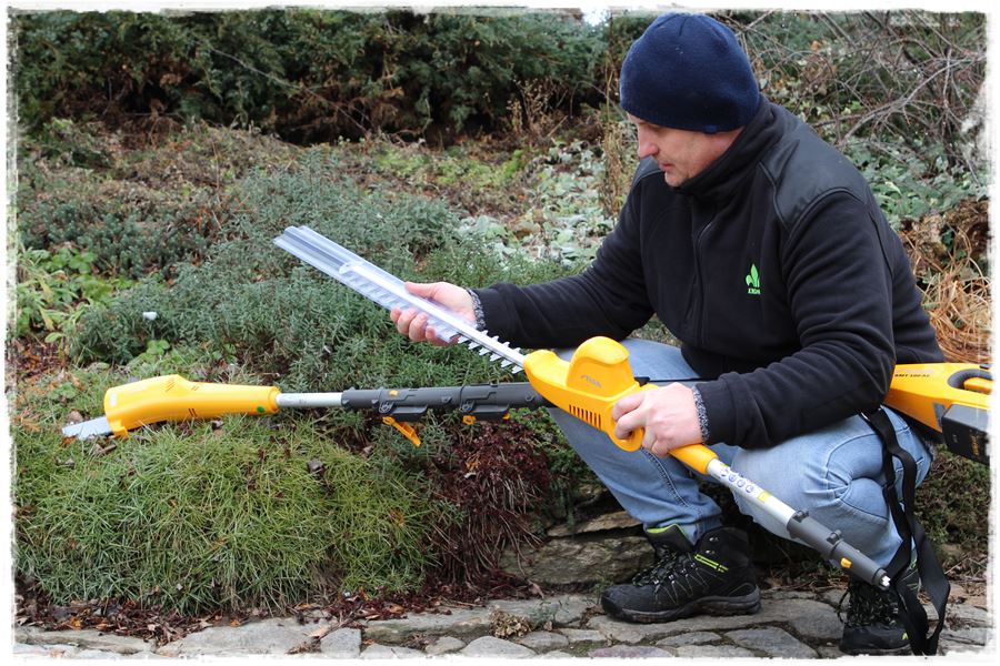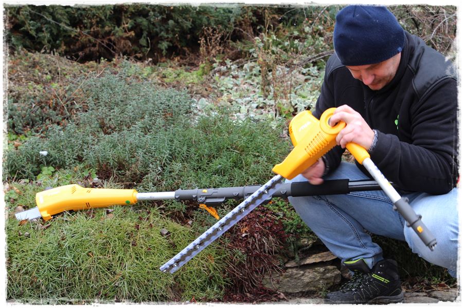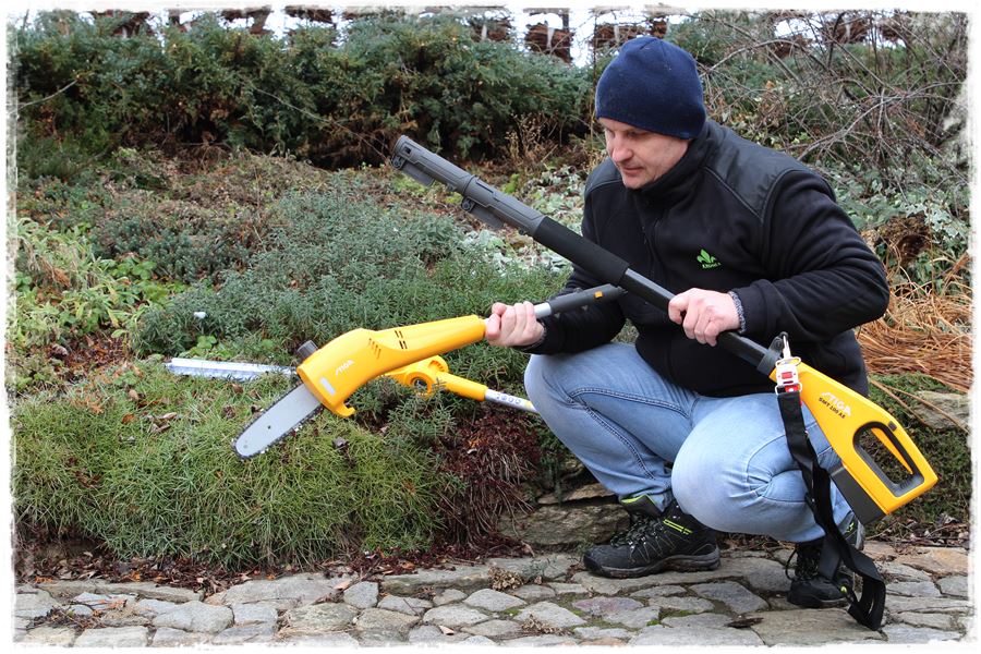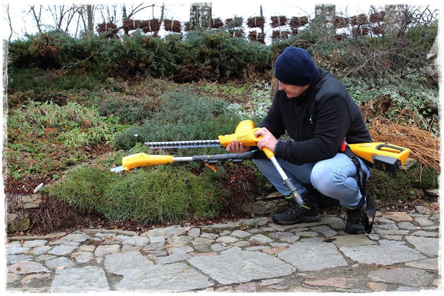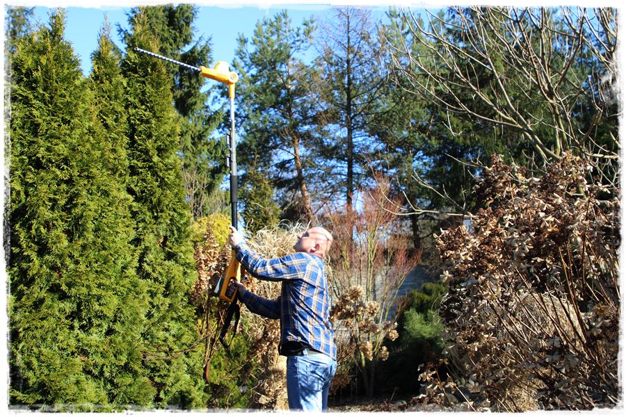 Dzięki temu urządzeniu możesz sięgnąć nawet do około 4 metrów, na co składa się 2,75 metra wysięgu samego urządzania plus do tego wysokość operatora. A jak wiesz, 4 metry stanowi prawie wysokość przeciętnego domu dwukondygnacyjnego. Do przycinania żywopłotu i drobnych krzewów służy wycinane laserowo ostrze o długości 45 centymetrów, a dzięki rozstawionym o 18 milimetrów zębom oraz obracanej o 112 stopni głowicy, umożliwia przycinanie nawet średniej grubości gałązek. Z kolei przy pracy podkrzesywarką, wysokiej jakości prowadnica dociera do najciaśniejszych miejsc, a automatyczna pompa oleju zapewnia płynną pracę łańcucha. I to tyle tytułem wstępu, słowami producenta.