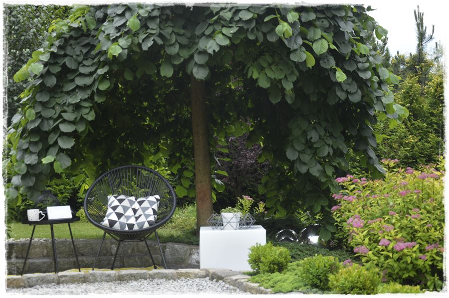 Uwielbiam tam przebywać w upalne dni. To doskonałe miejsce relaksu, z którego rozpościera się widok na cały ogród. Można tu zaszyć się przed całym światem z książką i kubkiem kawy. Lubię tu posiedzieć również po zmroku. Aby jednak jeszcze lepiej wyeksponować niezwykle atrakcyjną koronę wiązu „Camperdownii” warto ją podświetlić od dołu.