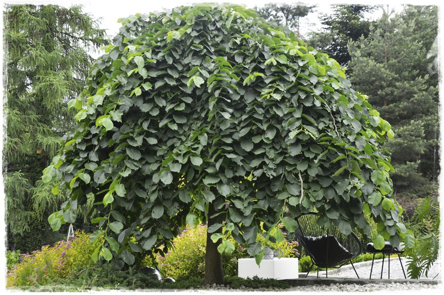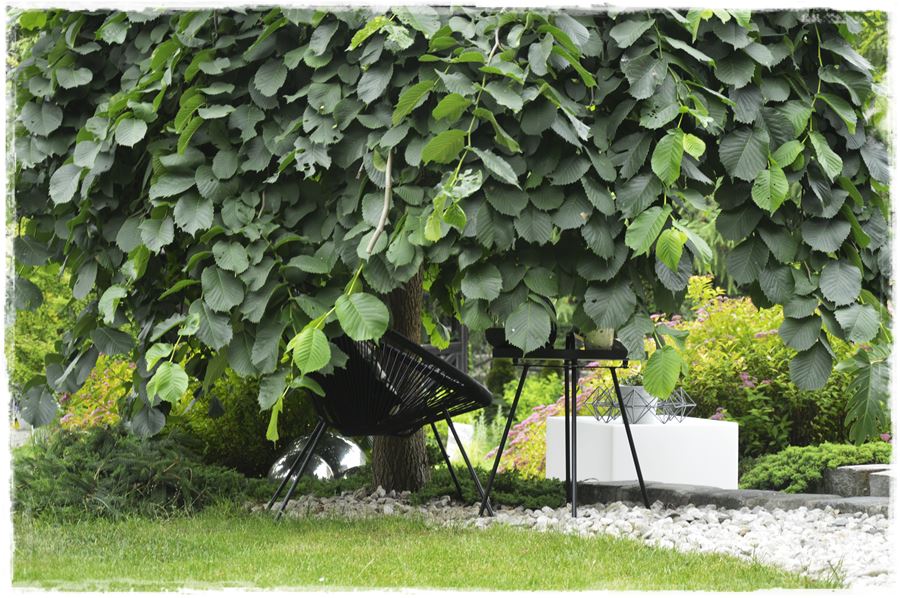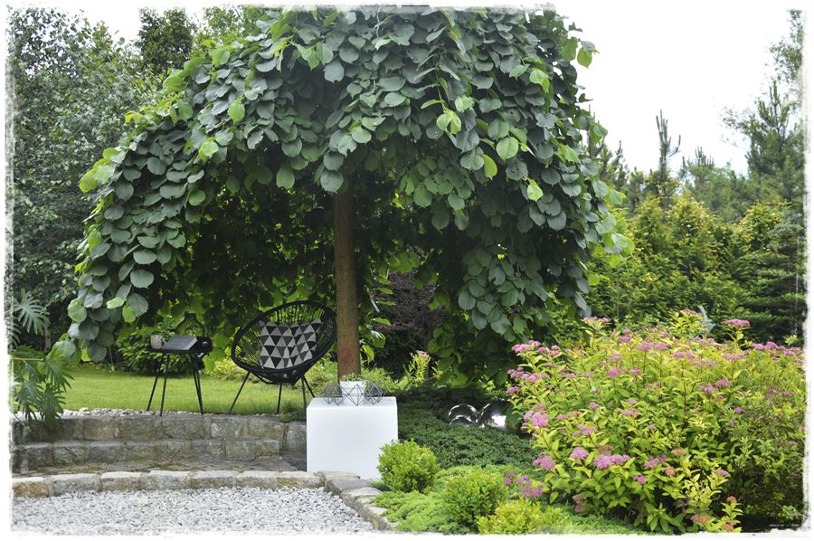 Świetnym sposobem na stworzenie kameralnego, cienistego miejsca w ogrodzie, jest posadzenie jako soliter, drzewa liściastego o pokroju płaczącym. Pod parasolowatą koroną tworzy się naturalna altana, którą można wykorzystać jako miejsce odpoczynku w upalne dni.