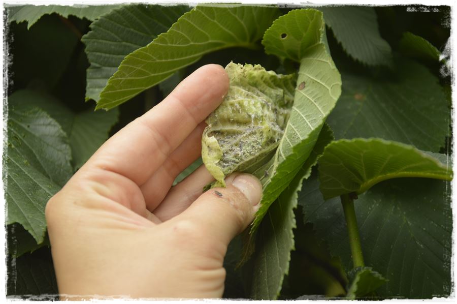 - narośla / galasy na górnej stronie liści – efekt żerowania mszycy bawełnicy wiązowo – zbożowej: