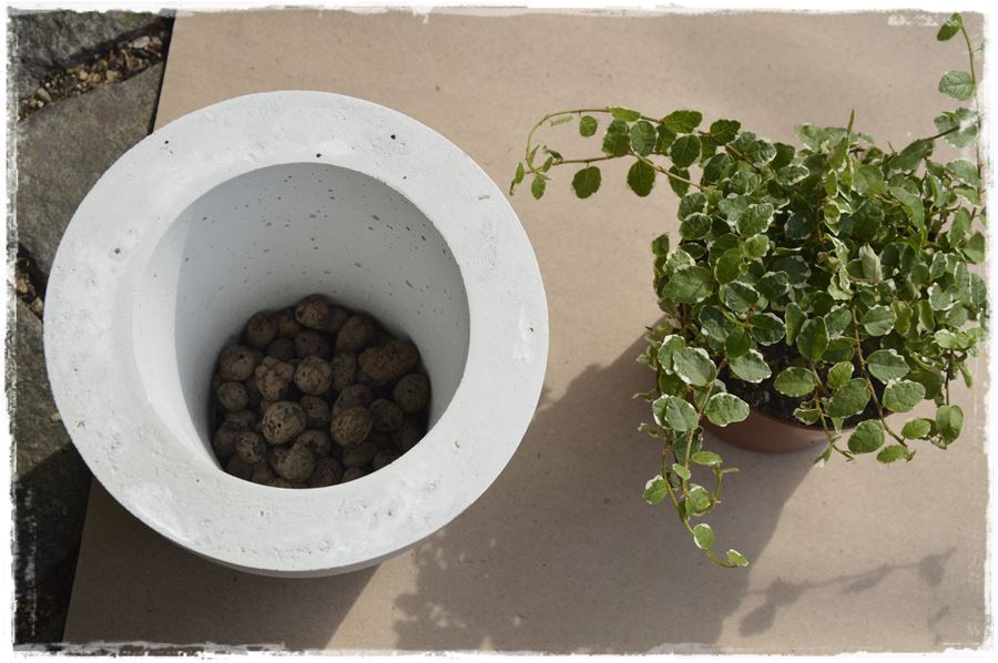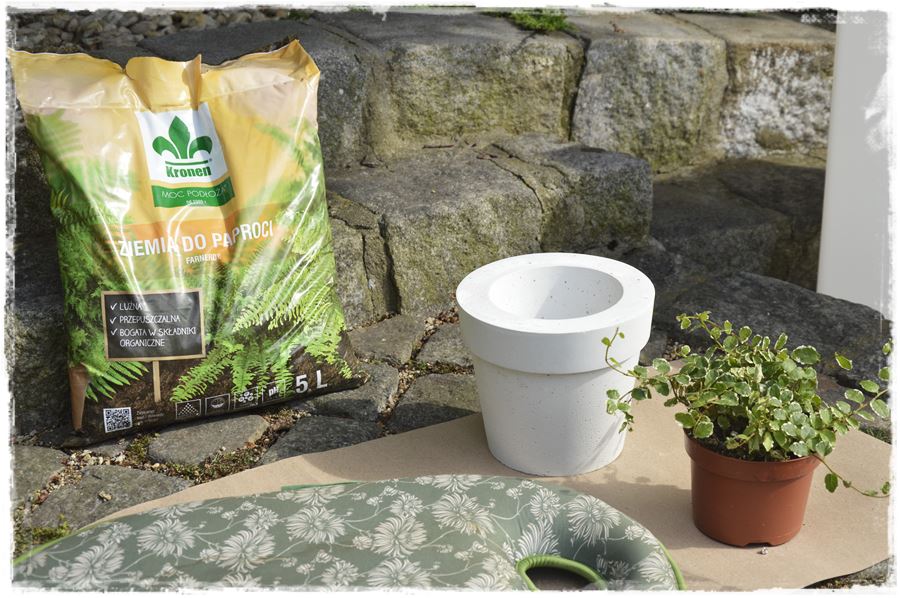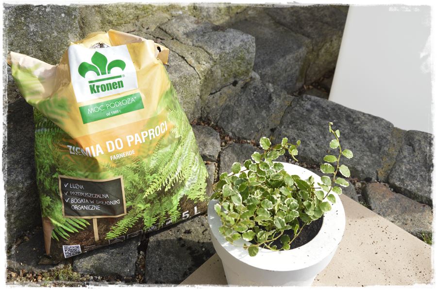 Za dnia stanowi bowiem dekoracyjny mebel, na którym wyeksponowałam ciekawą kompozycję z Fikusem Ficus pumila „Sunny” w roli głównej. Potrzebuje on dużo światła, ale nie powinien rosnąć w pełnym słońcu. Tak więc stanowisko na stoliku w sąsiedztwie wiązu jest doskonałe. Do wypełnienia donicy betonowej własnej roboty użyłam specjalnej mieszanki ziemi KRONEN, przeznaczonej do paproci.