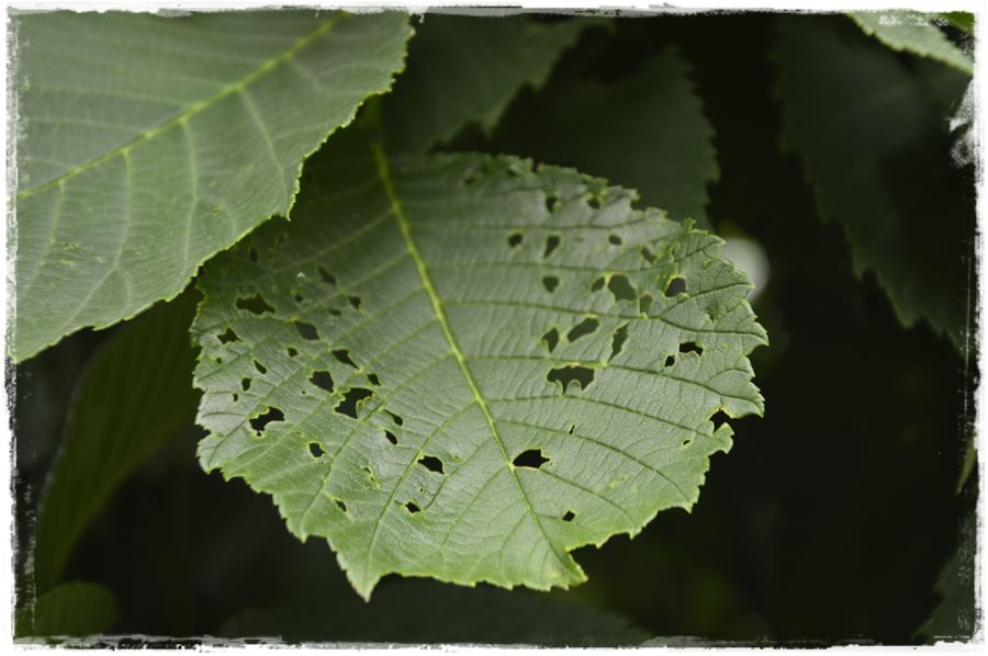 - dziury wygryzione w liściach – efekt żerowania np. jotka wiązowego lub innych szkodników z grupy błonkówek: