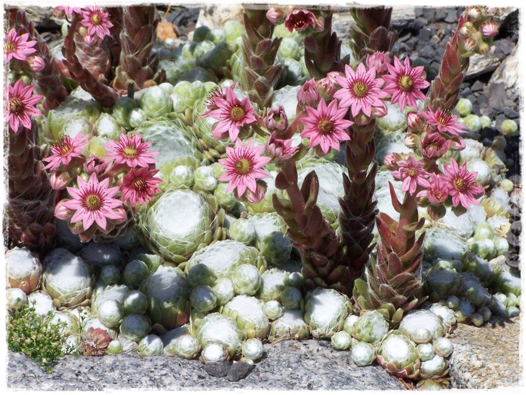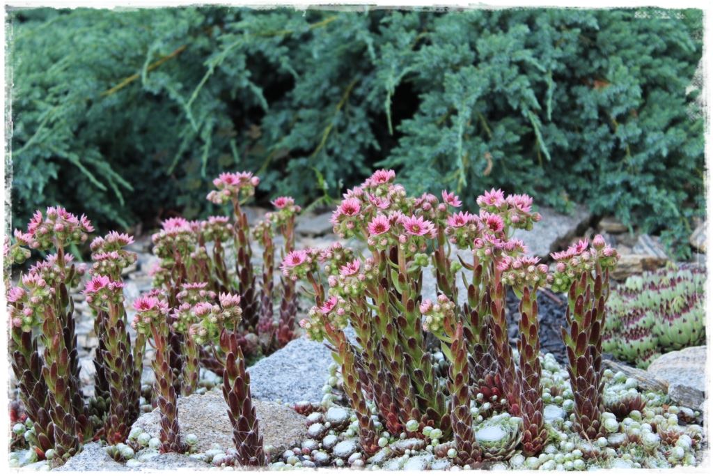 Na początek jednak kilka słów o samych roślinach wg Wikipedii: Rojnik (Sempervivum L., w dosłownym tłumaczeniu z łaciny znaczy zawsze żywe) – rodzaj roślin należący do rodziny gruboszowatych. Obejmuje od około 40 do 100 gatunków, łatwo się między sobą krzyżujących. Obszar ich naturalnego występowania obejmuje tereny od Maroka do Iranu. Rojniki to rośliny zielne, wieloletnie o niepodzielonych, grubych i mięsistych liściach, na brzegach orzęsionych, tworzących różyczkę liściową, czasem półkrzewy. Pęd kwiatostanowy osiąga do 10–60 cm wysokości.