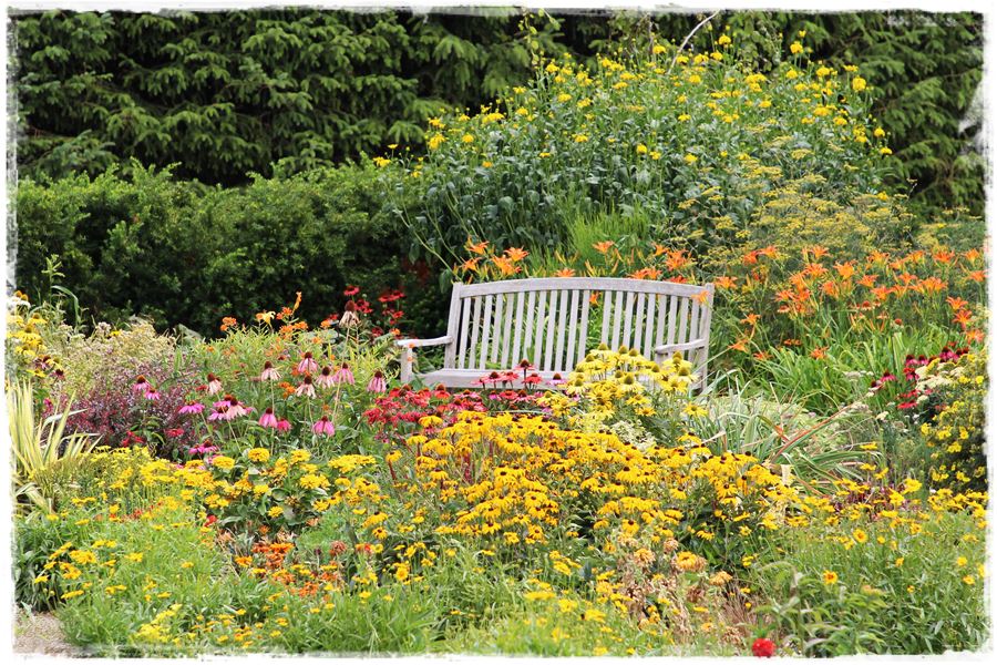 Ławki wśród kwitnących rabat