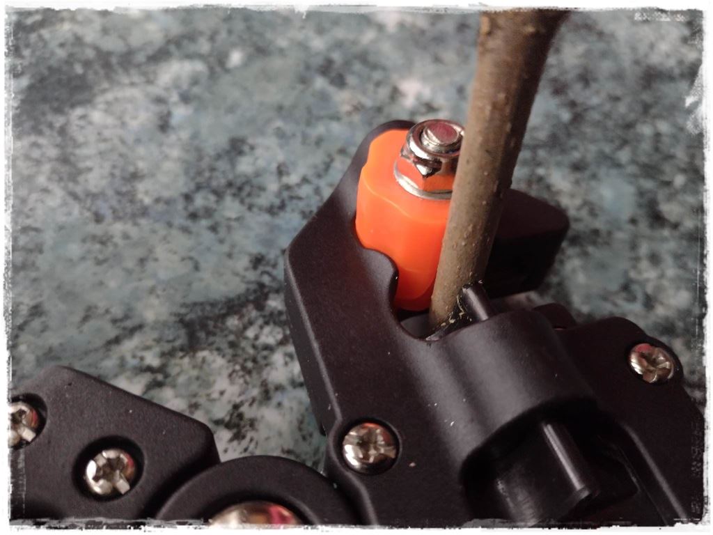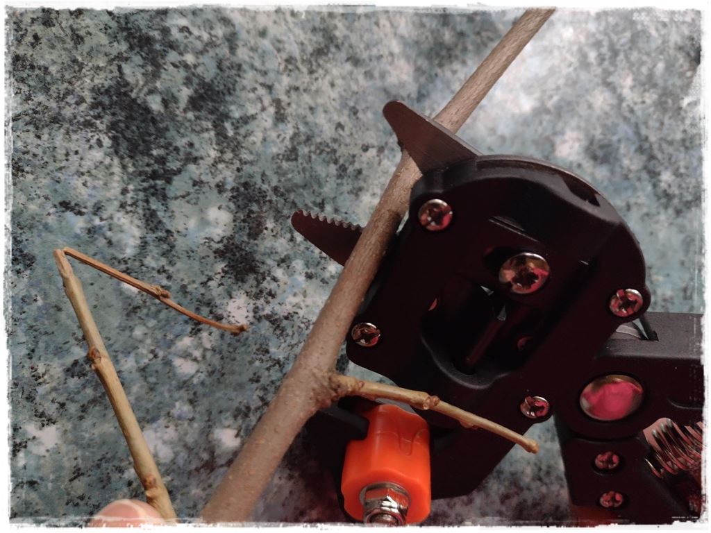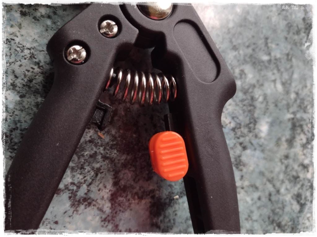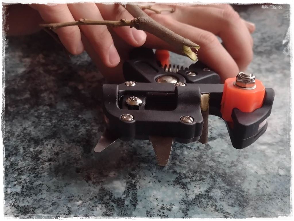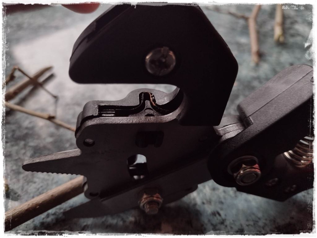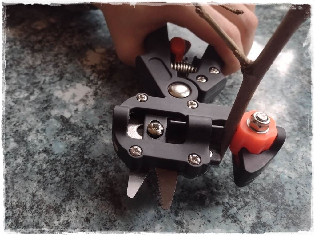 Narzędzie posiada też funkcję normalnego sekatora nożycowego o ząbkowanych ostrzach – przyda się, gdy zechcesz przyciąć zbędne gałązki.