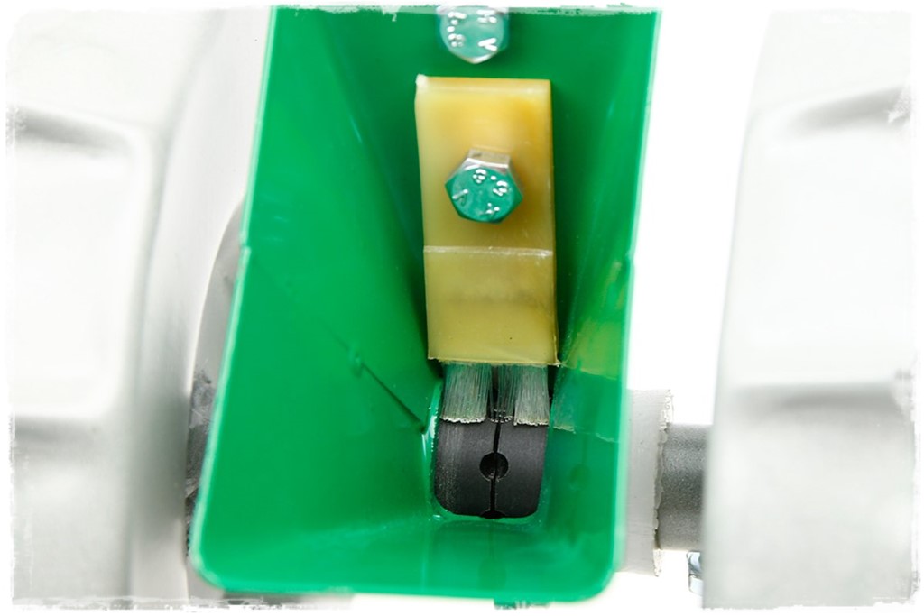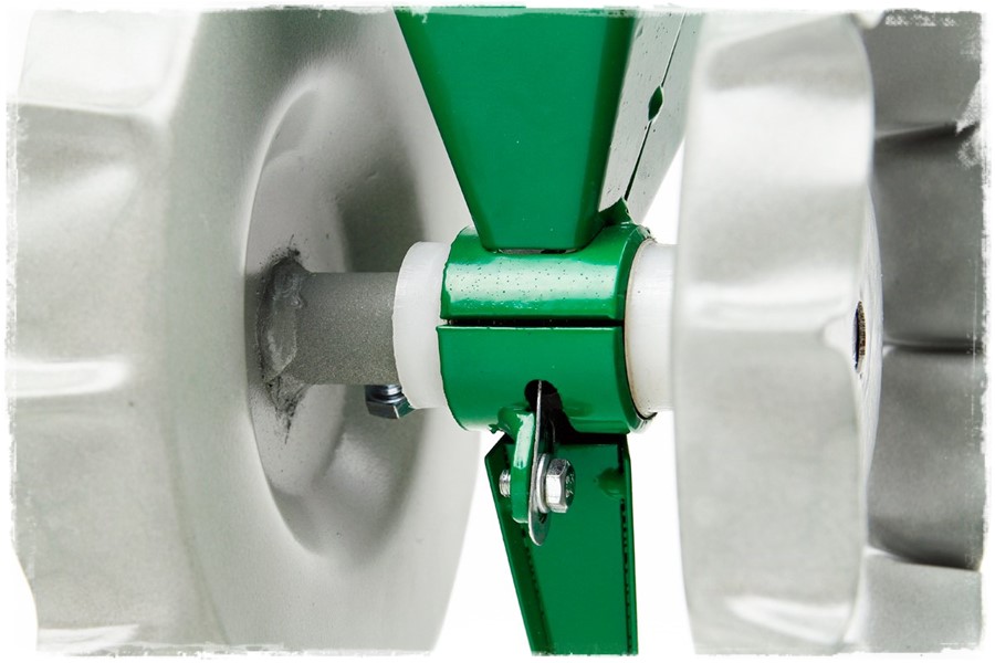 Jak widzisz bębenek jest zamontowany na dnie specjalnego leja, do którego zasypujesz odpowiednie nasiona. Jednocześnie bębenek jest umieszczony na obrotowej osi kół, a zatem obraca się wraz z nimi. A skoro się obraca, to widoczne nad nim szczotki, wpychają zasypane nasiona do otworów. Następnie nasiona te wypadają w dół, wraz z obrotem bębenka i wpadają do widocznego poniżej specjalnego leja, którym aplikowane są do gruntu.