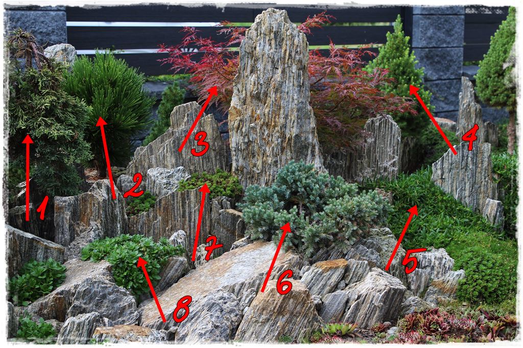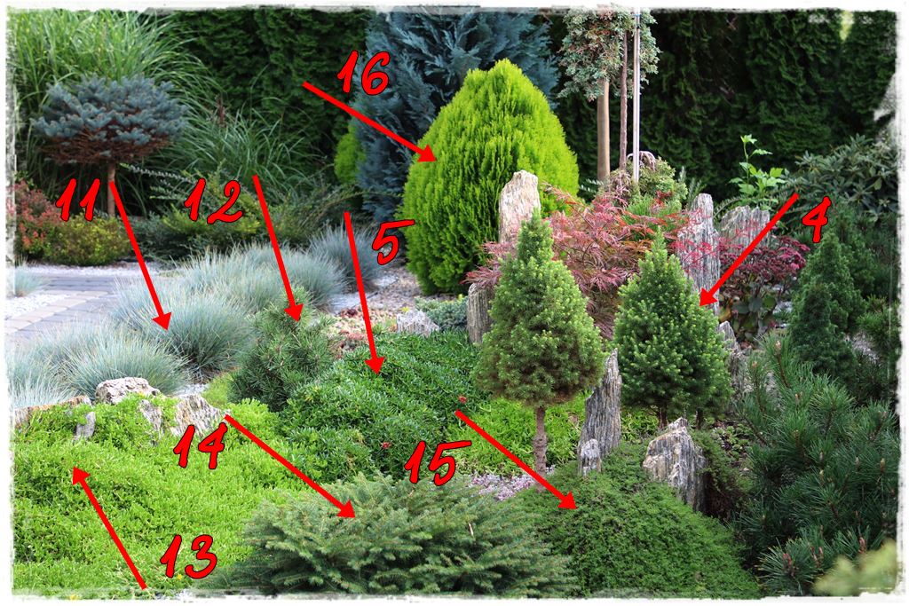 2 to kosodrzewina ‘Varella’ lub ‘Jezek’ lub podobna miniodmiana szczepiona na pieńku. 7 to prawdopodobnie rozchodnik sześciorzędowy lub jakaś skalnica, ale słabo widać