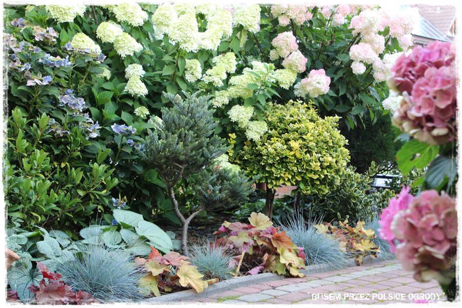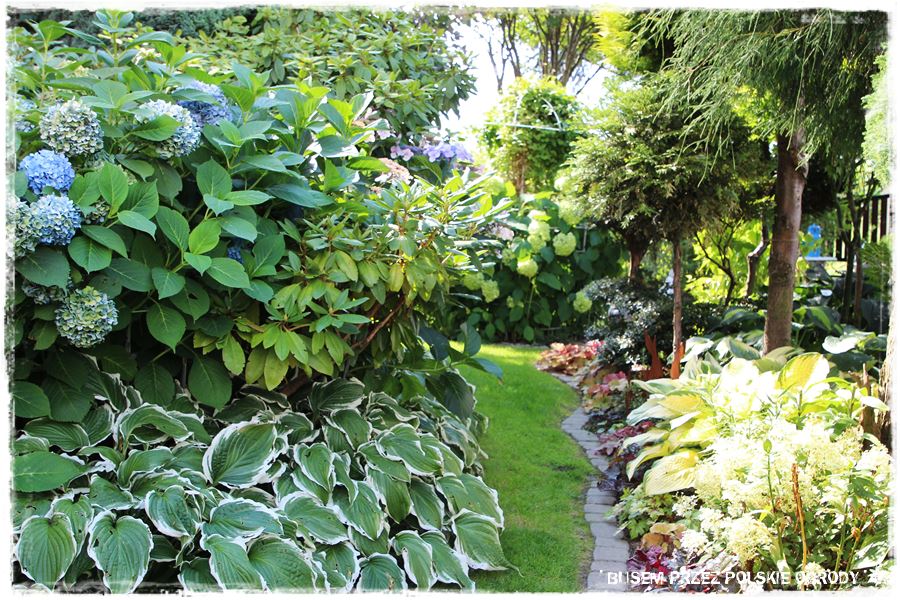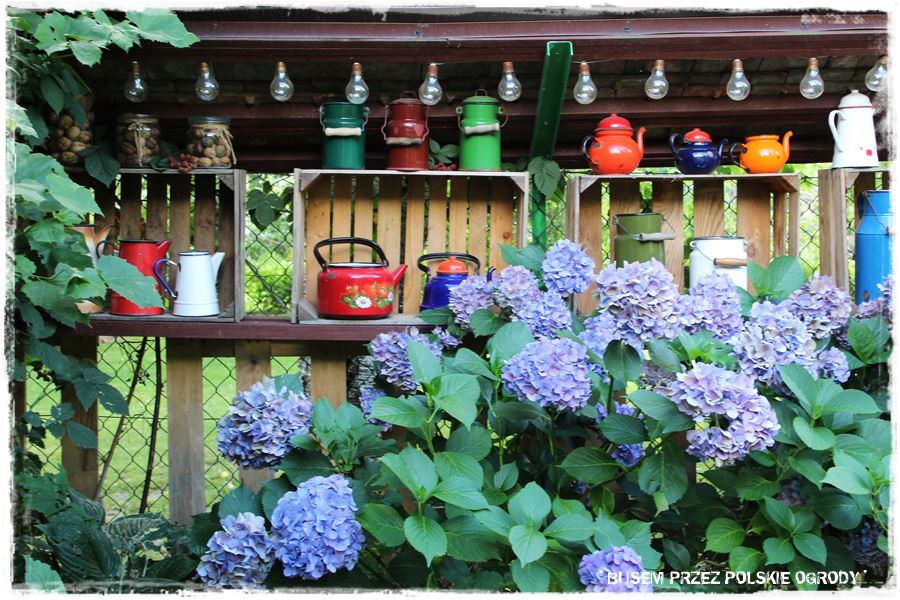Ogród Grażyny to wyjątkowo gęsty, pięknie obsadzony i udekorowany ogród, który tak naprawdę mógłby być małym arboretum. Setki odmian roślin, dobrze dobranych i skomponowanych. Nie sposób ich tu wszystkich wymienić, dlatego szczególną uwagę chciałbym zwrócić na kilka spraw. Przede wszystkim na hortensje, które Grażyna szczegółowo omawia w wyżej wspomnianym filmie. Mnóstwo odmian, zróżnicowanych nie tylko gatunkowo, ale przede wszystkim kolorystycznie.