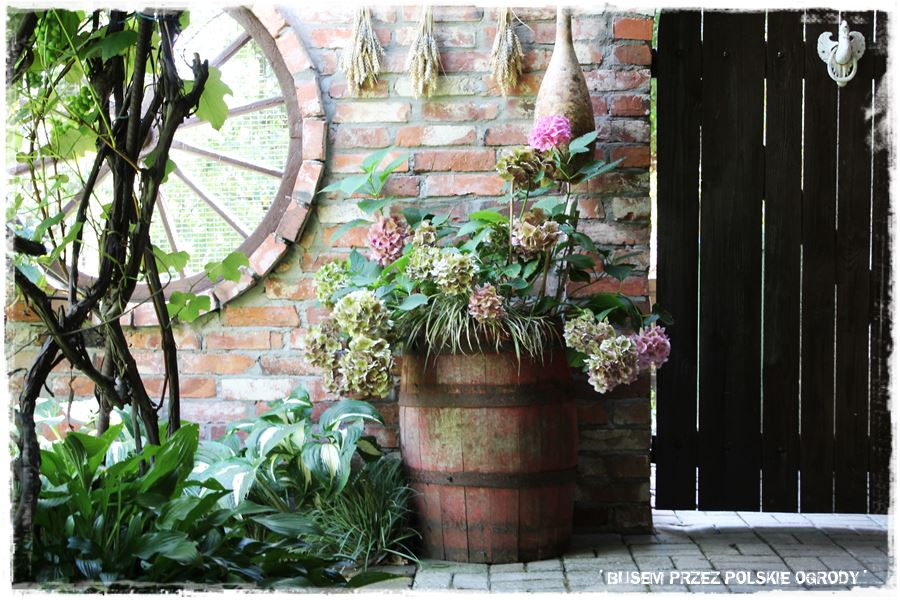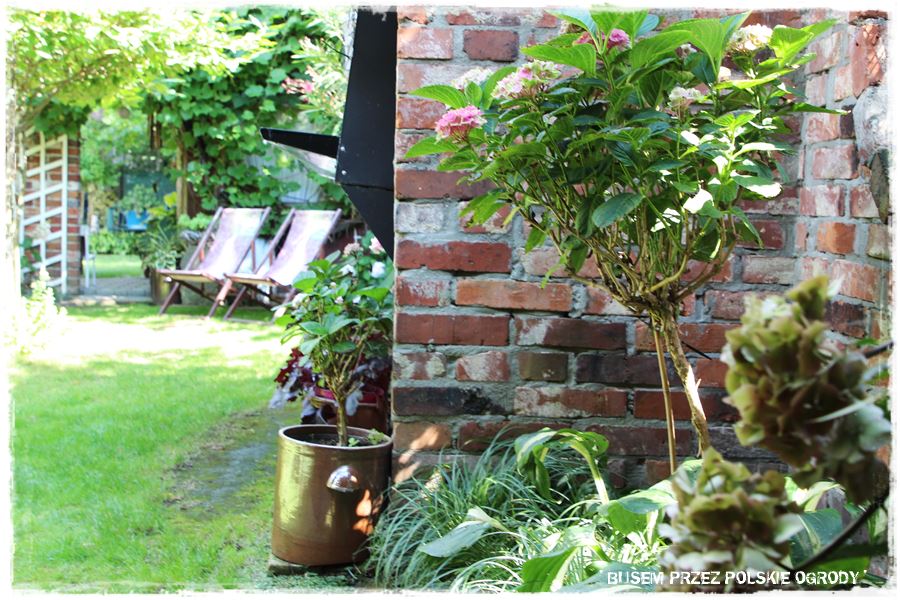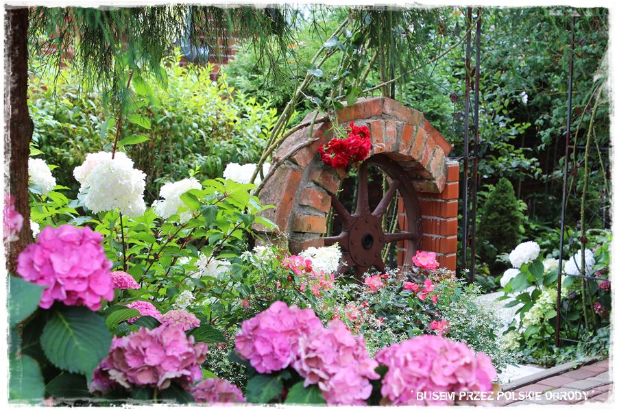 Ogród 14 – ogród ze starą cegłą, hortensjami i starociami