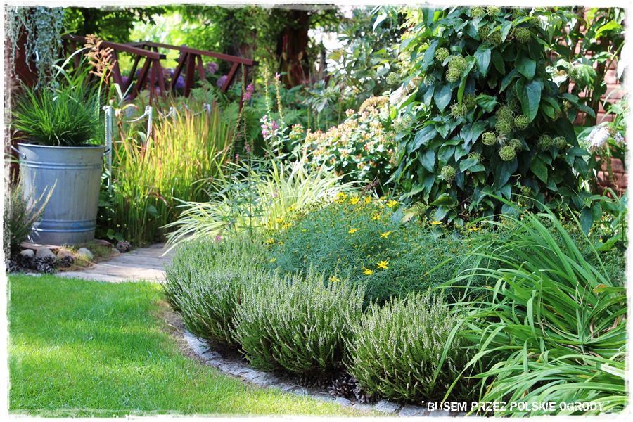 Sprawę roślin chciałbym zamknąć tym trawiastym zakątkiem. Poza trawami, choćby wysokimi miskantami, zwróć uwagę na wspomniane niskie piętro roślin zaaranżowane wrzosami oraz nasadzeniami w donicach.