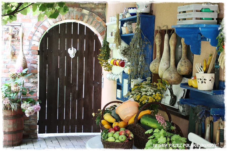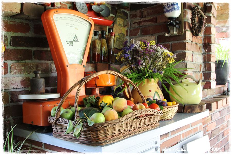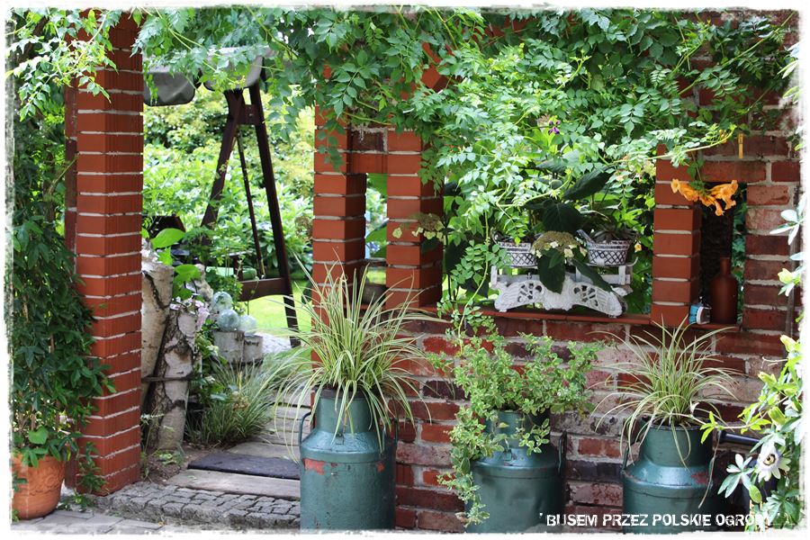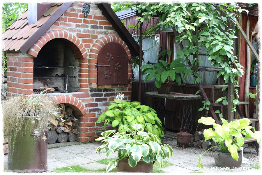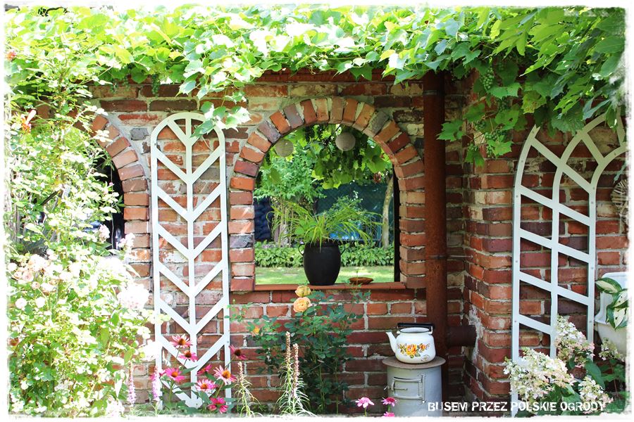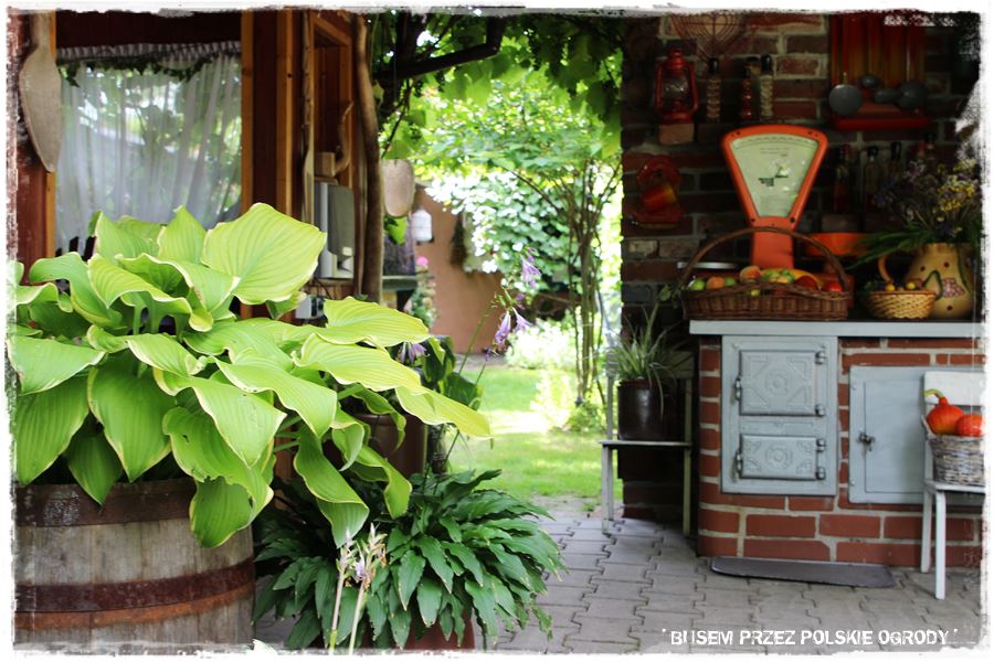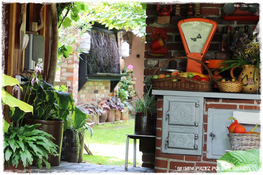 No dobrze. To tyle jeśli chodzi o rośliny. Czas na kolejne, tytułowe elementy. Na początek cegła, w większości stara, porozbiórkowa, która w tym ogrodzie dosłownie króluje. Obecna jest w wielu elementach, które tworzą określone strefy ogrodu. Na początek wyjątkowa kuchnia letnia, w której Grażyna w sezonie gotuje i robi przetwory.